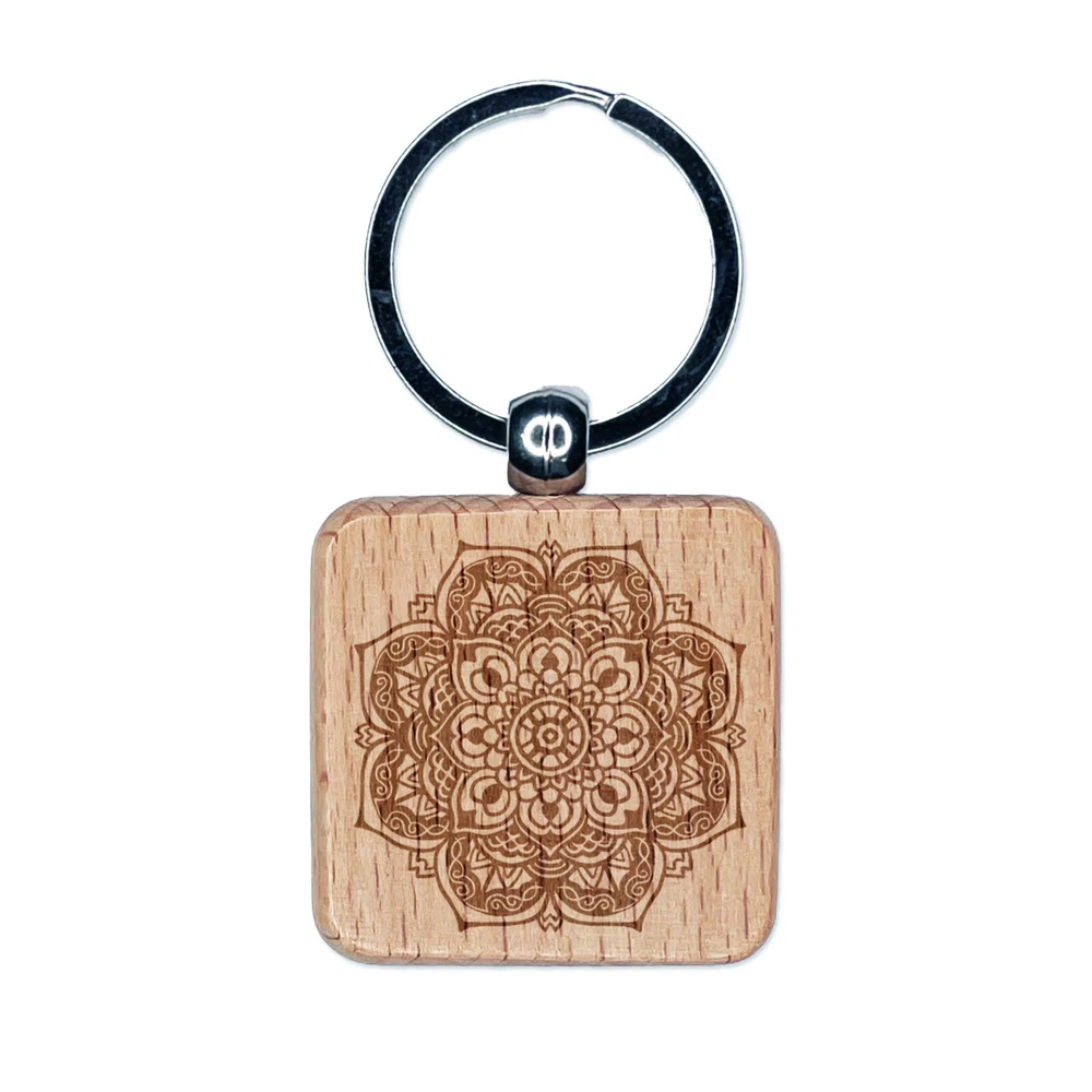 Mandala Geometric Flower Engraved Wood Square Keychain Tag Charm