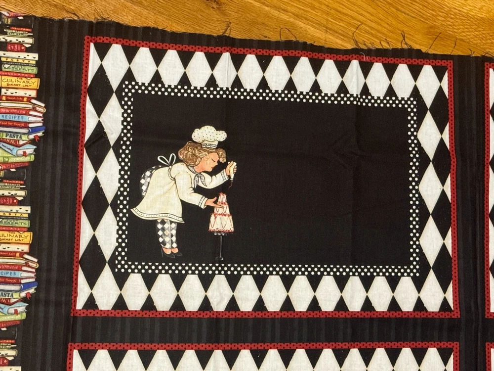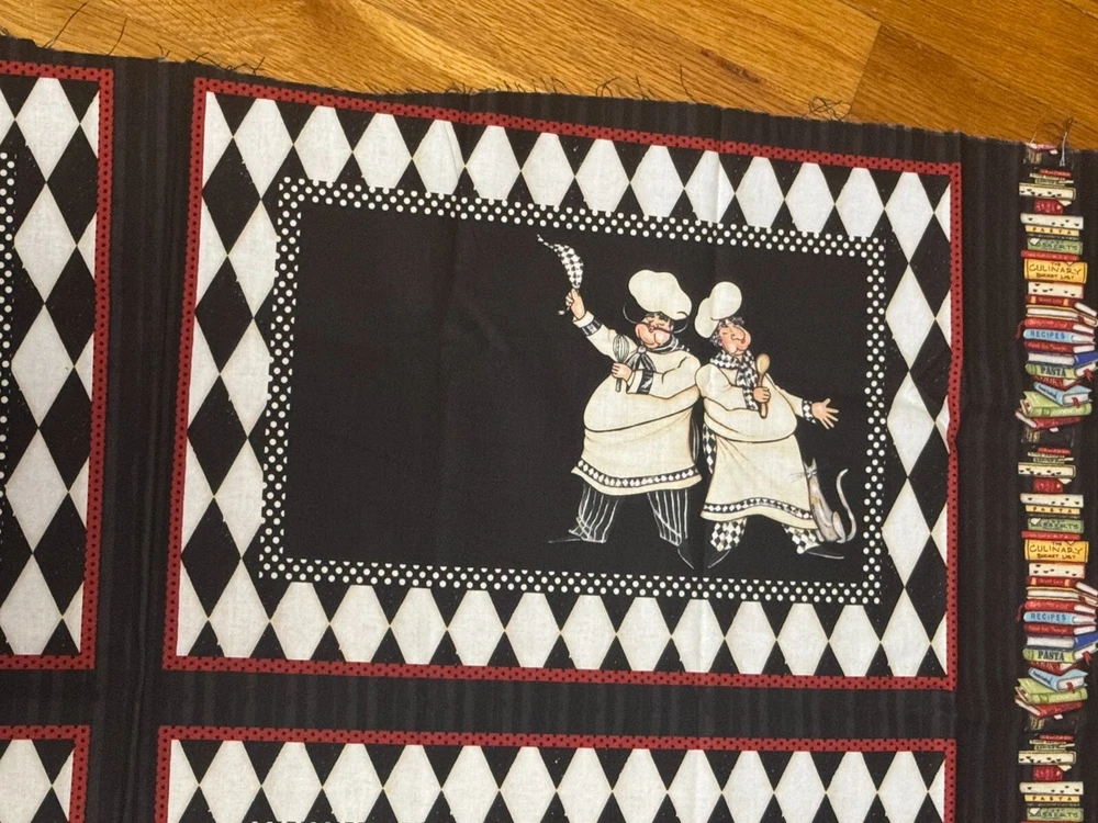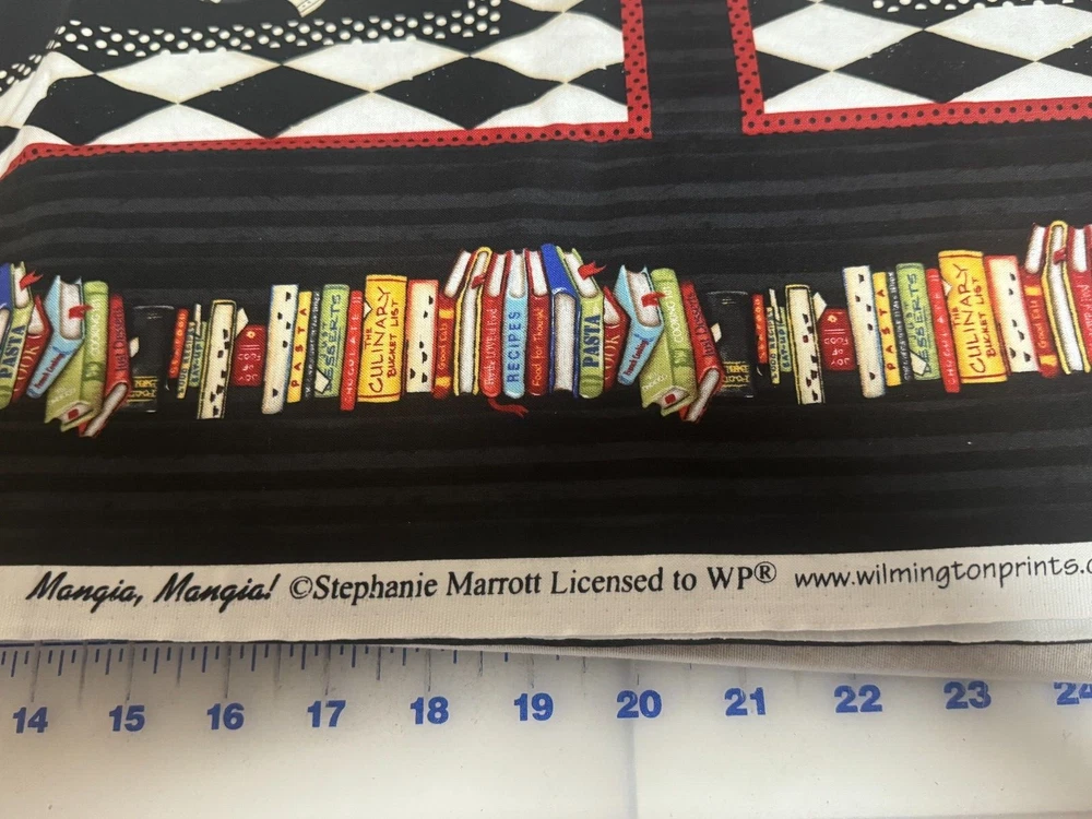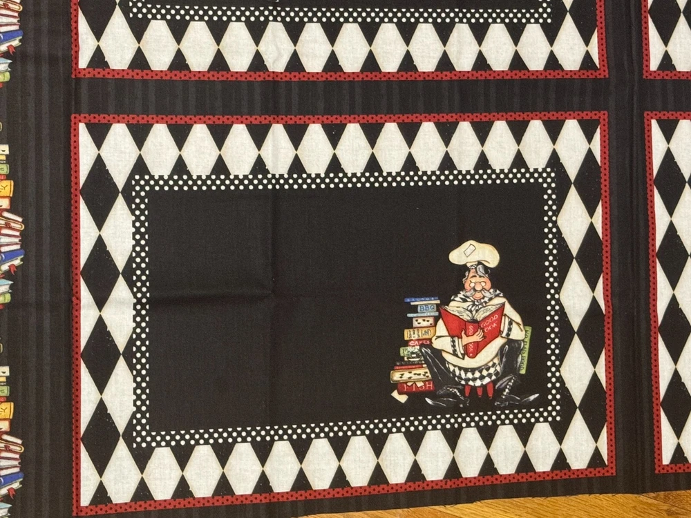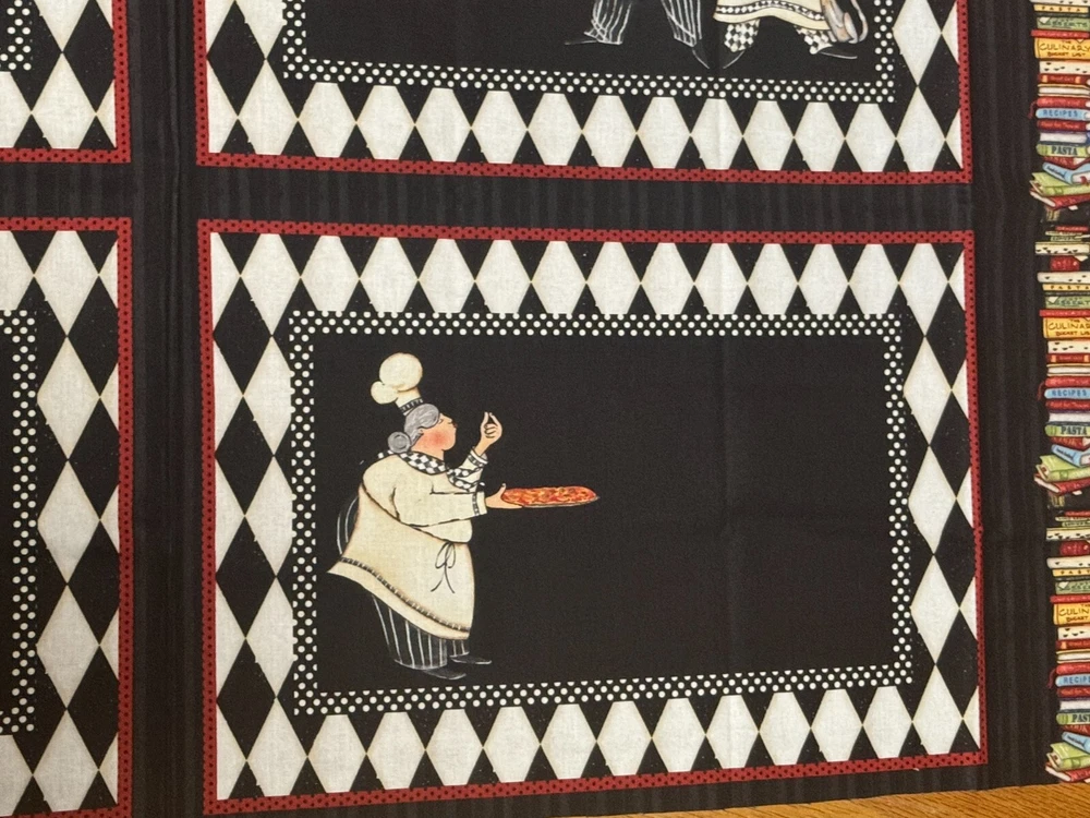 "Mangia - Mangia Chef " Set of 4 Placemats Fabric Panel Discounted NOTE: one side of the panel has a close cut of a little less than 1/4" inch so you will need to use a narrow seam if you want to maintain the outer red border. A Wilmington fabric made from 100% cotton Be sure to stop by my store - I also have lots of fabric panels for aprons, wall hangings, placemats and potholders, something for everyone who loves to sew quick gifts or projects. I also have lots of handmade items.
