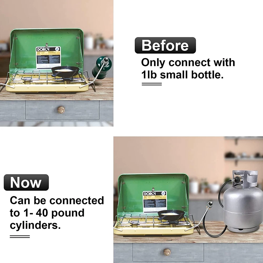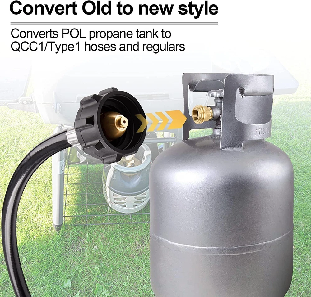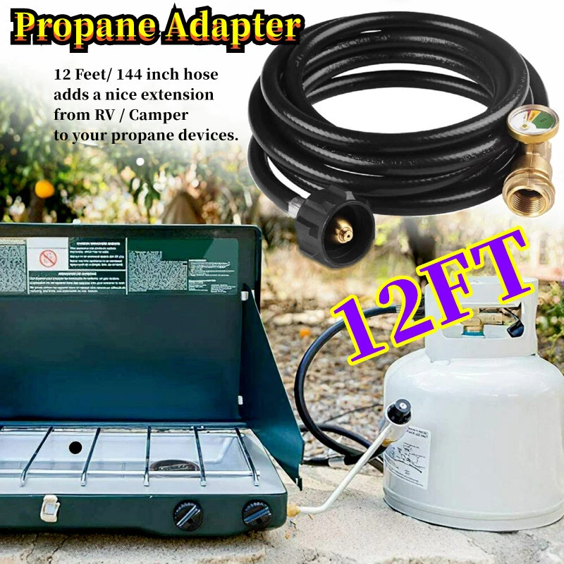 eBay 12 Feet Propane Tank Hose Extension with Gauge for Gas Grill, Heater and All Other Propane Appliances, Acme to Male QCC/POL Fittings Description UNIVERSAL- Compatible with all appliances with a QCC1 / type1 connection and up to 40 lb. propane tanks. CONVENIENCE- Come with 12 Feet long hose. You don't have to pull your propane tank out to read the dial on the gauge. More convenient than normal propane tank gauges. SAFETY- Built in leak detector to restrict flow in case of hose or grill malfunction HEAVY DUTY-100% solid brass construction withstands weather, scratching, denting and corroding. HASSLE FREE- Ready to use out of box / Fits all Propane tanks with QCC connection. Will not read levels immediately: begins working when propane is flowing Product Description Propane Tank Extension Hose with Gauget for Gas Grill, Heater and All Other Propane Appliances, Acme to Male QCC/POL Fittings 1.If you own it. You don't have to move your propane tank. You don't have to pull your propane tank out to read the dial on the gauge. More convenient than normal propane tank gauges. 2.Can I use it on a 100 lb. propane tank? Yes,It can be used with 100lb tank, yet you need an adapter with POL connection. Choose the adapter showed below. Color Coded Dial for Easy Viewing Monitors fuel level without removing the tank.No need to bend over or squint at tiny level markings. One glance at the DozyAnt's large dial will tell you whether you're in the red (empty), yellow (low) or green (sufficient). Note : This gauge will not say exactly when the propane tank will be empty, rather it gives an approximation. In hot weather the pressure increases and in cold weather the pressure decreases, therefore the same amount of Propane will show different levels on the gauge's meter Length 5 Feet 12 Feet / Male Connection Type QCC1 (Type 1) & POL QCC1 (Type 1) & POL Used with the hose for 100lb tank Female Connection Type QCC1 (Type 1) QCC1 (Type 1) Used with the hose for 100lb tank