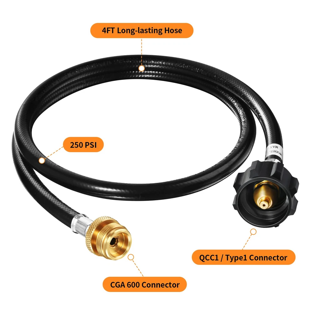 【Product Specifications】:The 4-foot propane hose is equipped with QCC1/Type1 fitting on one end and 1"-20 disposable cylinder external thread on the other. 【Save Money】:1lb to 20lb propane hose is compatible with all 1-pound portable devices, suitable for Weber Q grills, Coleman camping stoves, Blackstone 17" and 22" griddles, Buddy heaters, and more. You can reduce costs and minimize any waste associated with 1lb propane cylinders. 【Sturdy and Durable】: Propane hose is made from high-quality rubber and brass, providing enhanced durability and corrosion resistance. Its robust construction allows it to withstand harsh environments, remaining flexible even in cold winter conditions, making it ideal for portable devices. 【Easy to Install】:Propane tank adapter hose can be installed without any tools; you only need to manually tighten the handwheel end and the brass connector end of the product. With a 4-foot length, it's sufficient to connect to any portable grill or heater, so you don't have to worry about the propane hose being too long and causing wastage. 【CSA-Safety Certification】:The gas grill hose is CSA certified. If you encounter any issues during use, please contact us, and we will provide you with one year of warranty service.