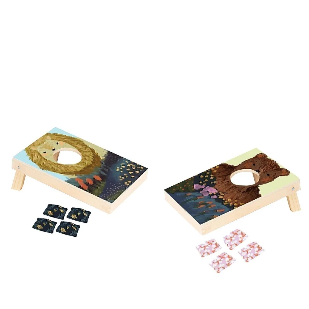 Wild Ones Bean Bag Toss Game This wonderful wood set for kids 3+ includes 2 boards and 8 patterned bean bags for some wild little-one fun! Introducing the Wild Ones Bean Bag Toss Game, a fun and wholesome way to entertain kids aged three and up! Crafted from high-quality wood, this cornhole board set will have your little ones tossing and laughing in no time! So get ready for some wild family fun--no matter the age, everyone's a winner. Suitable for ages 3 and up. Set includes 2 boards (one lion, one bear), 8 patterned bean bags (4 per player). Take turns tossing the beanbags and getting points. Encourages motor development, cooperation, and social learning skills through play. Store indoors when not in use. Key Features 2 boards (one lion, one bear). 8 patterned beans bags (4 per player). Encourages motor development. Specifications Comes boxed. Meets or exceeds ASTM, EN71 and CPSIA safety regulations. Gameplay instructions. Cleaning & Care Do not submerge in water; do not use in sanitizer, steamer, or, microwave; surface wash with damp soapy cloth, followed by a clean damp cloth to remove residue; or clean with baby safe pacifier wipes. If cleaning with baby-safe wipes: read the wipes label carefully; use as directed; test on small area first. CORNHOLE GAME SET FOR KIDS: The Wild Ones Decorative wooden cornhole play set for kids includes 2 boards with folding legs (a lion and bear) and 8 patterned bean bags (4 per player). MOTOR SKILL DEVELOPMENT TOY: Encourage toddlers 3 years and up in their motor skill development and hand-eye coordination skills with this fun and attractive bean bag toss activity playset. EDUCATIONAL TOY DISGUISED AS FUN: A fun game of bean bag toss is a good way to learn early social and communication skills as kids agree on rules, take turns tossing the bean bags – earning points for every bag that enters the hole in a friendly competition of skill. INDOOR OUTDOOR GAME FOR PRESCHOOLERS: While the Wild Ones bean bag toss set is an excellent backyard picnic game suitable for outdoor play in good weather, it's also an awesome indoor activity on rainy and cold days; animal theme corn hole boards measure 15.5"L x 9.5"W x 2"H with legs folded under; Ships in retail packaged box. STANDING BY OUR BRAND: If you're reading this, you've found a safe toy from a real company and a brand that cares. Since 1978, Manhattan Toy has been a trusted source of imaginative toys for babies, toddlers and kids of all ages. All of our toys are rigorously safety tested and every toy has our 800 number with a dedicated customer support team to answer your call.