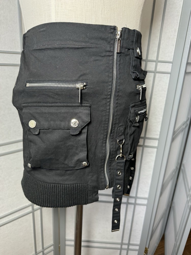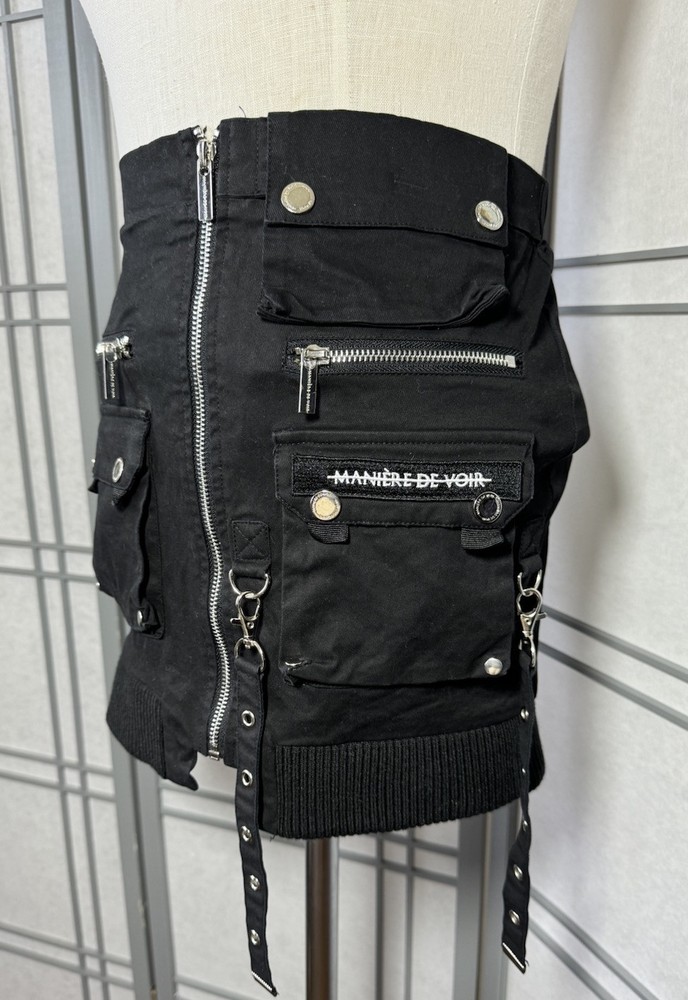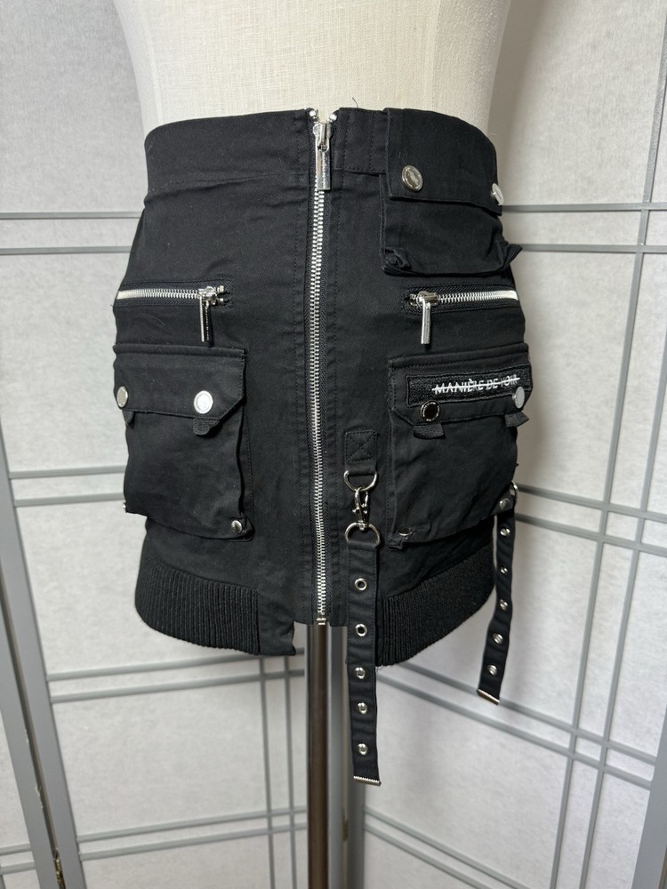 This Maniere De Voir Mini Skirt in size 6 is a stylish piece with a streetwear and gothic-inspired design. The skirt features a solid black color with studded accents and various hardware details like buttons, buckles, and zippers, giving it a unique and edgy look. Made from a combination of elastane and cotton, it offers a comfortable fit with a mid-rise waist and convenient pockets. The canvas fabric adds to its durability, making it a versatile piece for a bold and trendy wardrobe. EUC Size 6 Waist 24" Length 14"