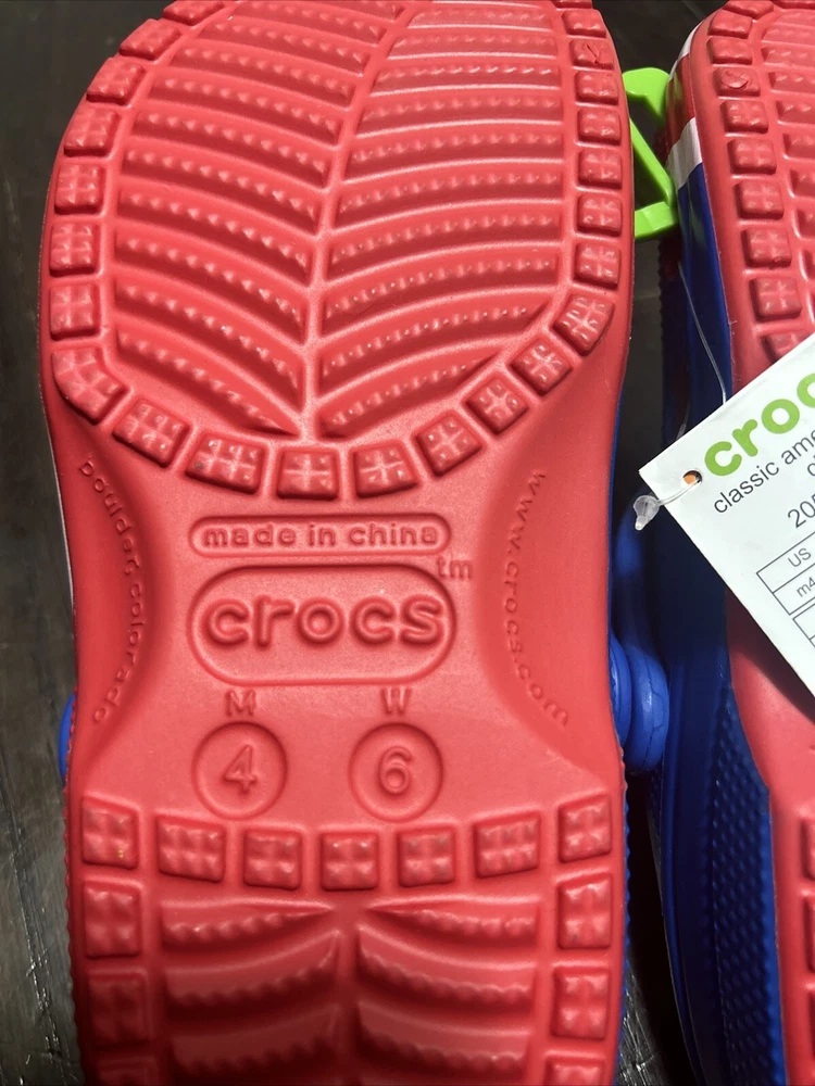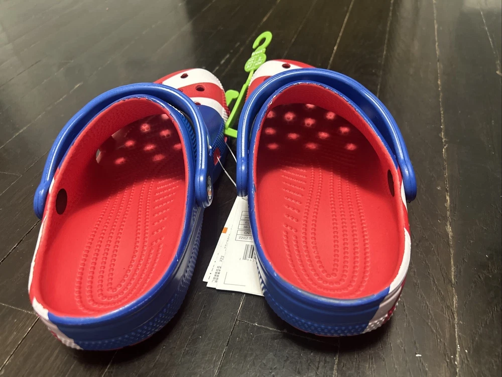The Crocs Classic American Flag Clog is a men's athletic sandal featuring a patriotic design with a flag theme. The upper material of the sandal is described in the item details, providing comfort and style for casual wear. Perfect for those looking to add a touch of American pride to their footwear collection, these Crocs offer a unique and colorful option for everyday use.