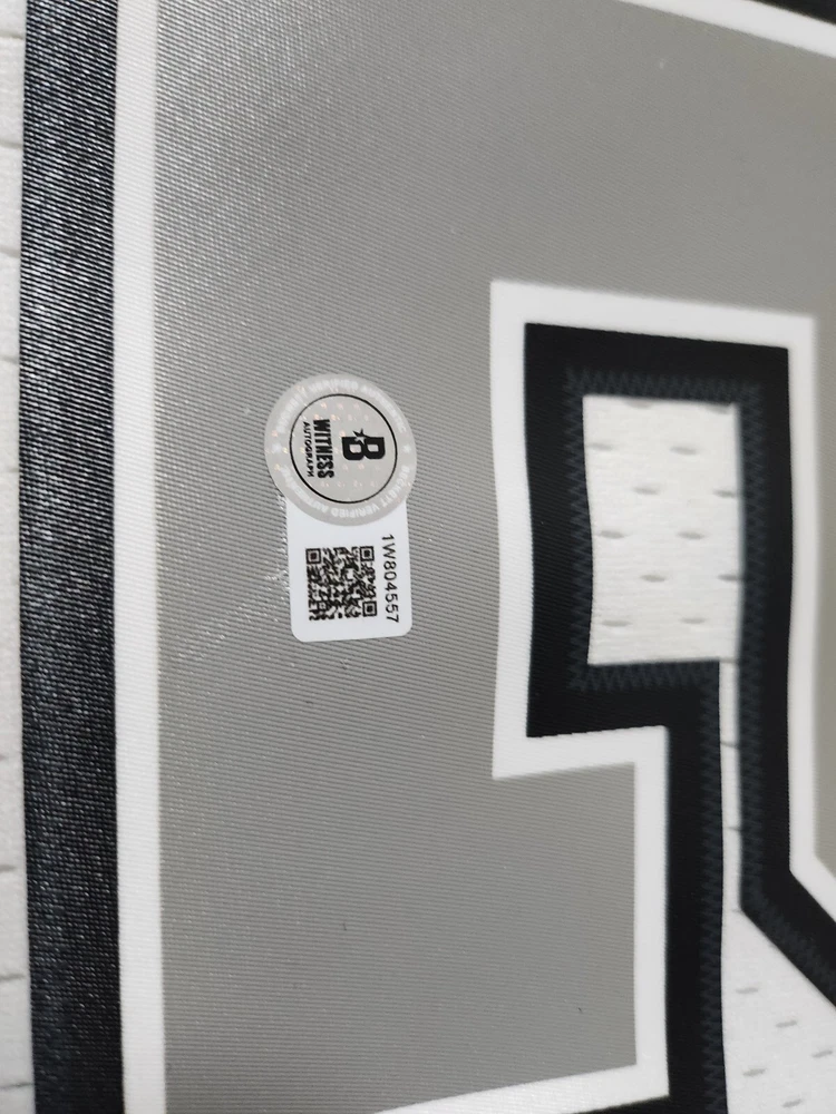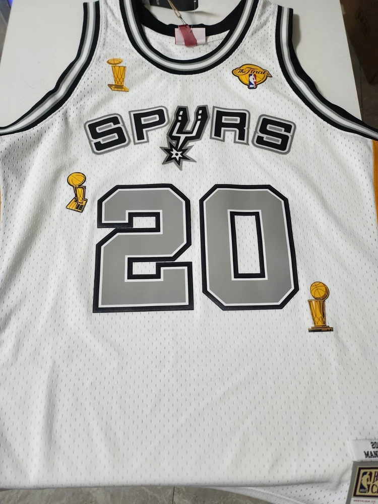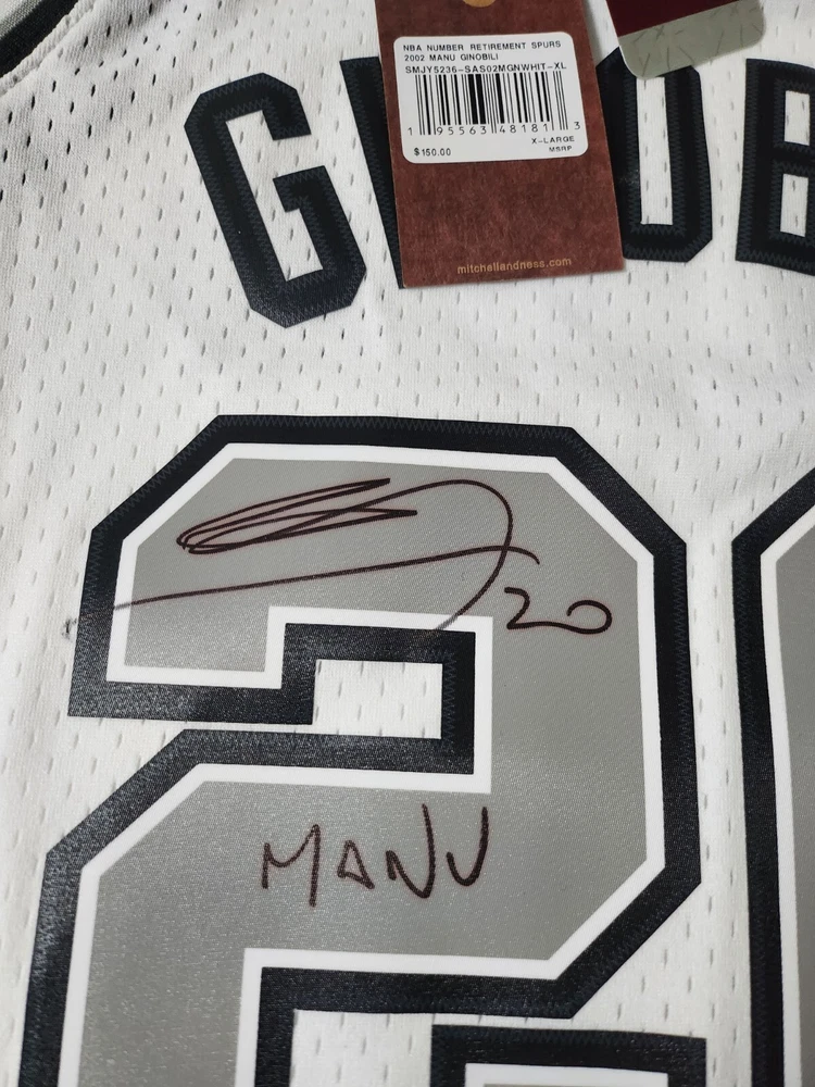 Own a piece of basketball history with this Manu Ginobili signed San Antonio Spurs jersey. This jersey is an original, authenticated by Beckett Authentication Services (BAS) and features Ginobili's signature in bold black ink. Perfect for any basketball fan or collector, this jersey is a must-have for any San Antonio Spurs enthusiast. Made in the United States, this jersey is a true piece of American sports memorabilia. Wear it proudly to the next game or display it in your collection.