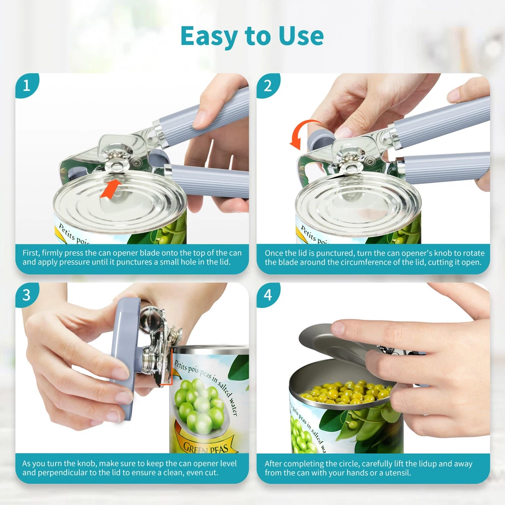 Ergonomic Design: Our handheld can opener features an ergonomic design that fits comfortably in your hand. It provides a secure grip, making it easy and comfortable to use and won't damage the jewelry on your hands. Effortless Opening: With its sharp cutting wheel, our handheld can opener glides smoothly along the edges of cans, making the opening process quick and effortless. Say goodbye to struggling with stubborn cans! Portable and Convenient: Compact and lightweight, our handheld can opener is the perfect companion for camping trips, picnics, or any time you are on the go. It easily fits into your kitchen drawer or backpack. Easy to Use and : Our handheld can opener is designed for utmost user convenience. Featuring a sharp cutting wheel and a puncture mechanism, it simplifies the can-opening process. To use, simply position the opener's puncture point at the top of the can, apply slight pressure to create a hole, then attach the opener securely to the can's rim. Effortlessly turn the handle to rotate the cutting wheel along the can's edges until it completes a full rotation. Durable and Long-lasting: Our handheld can opener is made from high-quality materials, ensuring durability and longevity. It is built to withstand regular use and will be a reliable tool in your kitchen for years to come.