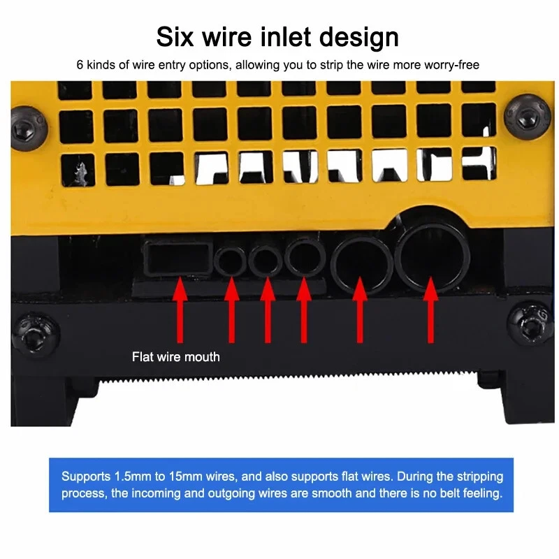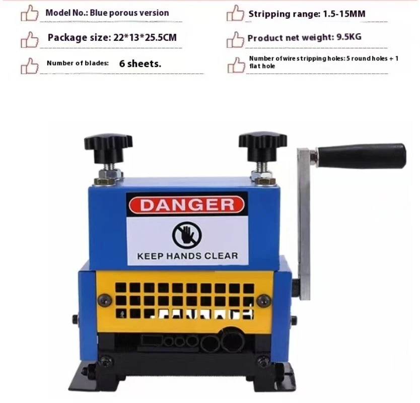 Manual stripping machine porous small home hand cranked peeling machine scrap copper wire peeling machine Product Model:Blue Porous Version Stripping range:1.5-15 MM Package Size:22*13*25.5CM Net weight:10KG Number of blades:6 Number of holes:5 round holes+1 flat hole