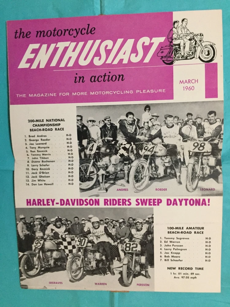 ITEM:::: This Listing is for an original March 1960 issue of HARLEY-DAVIDSON "ENTHUSIAST MAGAZINE" Motorcycle Dealer Sales Magazine..... . DIMENSIONS:::: About 9 by 6 inches and it unfolds 1 time; then there are 8 larger pages with covers.. ...... CONDITION:::: The general overall condition is G/VG ...... (Please refer to pictures & e-mail for details). ......... ABREVIATIONS:::: E=Excellent with no issues..... VG = Very Good with very lite issues..... G/VG = Good to Very Good with lite issues..... G + = Good+ with lite to moderate issues..... G = Good with moderate issues..... G - = Good- with moderate+ issues..... F/G = Fair to Good with quite a few issues..... F = Fair with many issues..... P = Poor with lots of issues..... Please let the pictures help you decide condition because they are an integral part of the description! Please e-mail with questions...... I will combine shipping & you will only pay $6.98 for shipping no matter how many items you accumulate! You can take up to 30 days to accumulate Items for combined shipping. Please drop me a note after your 1st win letting me know that you intend to wait to pay so that you can take advantage of combined shipping...... I will ship your Package to the address that you have registered on EBAY---Ergo, I will ship to the address that is on the shipping label when I print it from EBAY---Please do not ask me to ship to any other address---I will not do it! My goal is 100% satisfaction! I will refund 100% of your costs if you are not satisfied! Thanks for visiting!