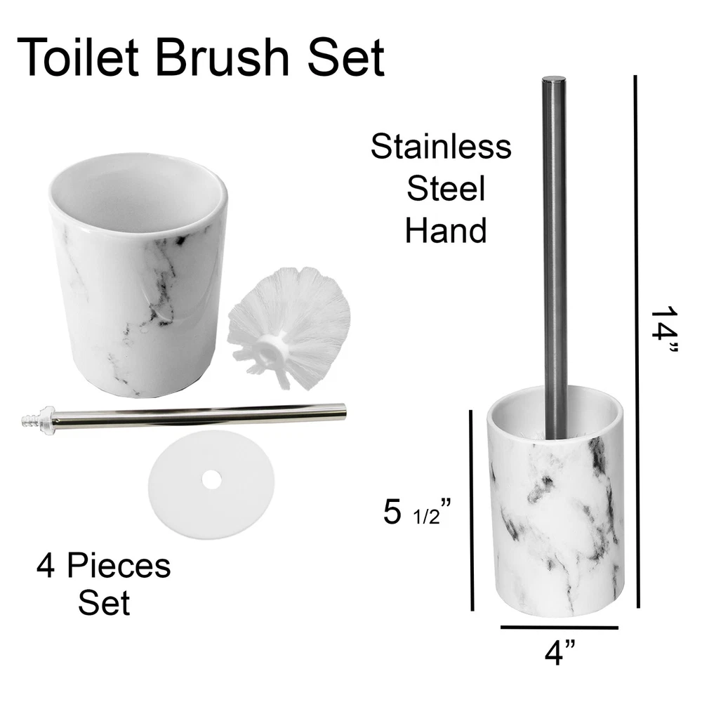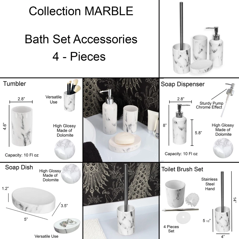 Choose the piece you need or the full set MARBLE EFFECT DESIGN: Enjoy the unique combination of the shiny smooth surface and the printed marble design of this bathroom accessory set which brings a sophisticated and modern style to your bathroom. 4 PIECES MATCHING COLLECTION: Complete your bathroom countertops with those accessories featuring a tumbler, a soap dispenser, a toilet brush with holder and a soap dish cup HIGH-QUALITY: Enjoy the sturdy construction of this set of 4 pieces, this bathroom set is made of durable polyresin which is rust free, the bottom is textured to avoid any slippage from the counter top or from the floor. This lovely bathroom accessories set will last for years on any bath, kitchen counter top, vanity or bath floor VERSATILE: The perfect decoration accessories set for master, guest or kids bath. Add a nice touch to your counters, kitchen, laundry or vanity. Also suitable for commercial use PERFECT GIFT: For its stylish design and the convenience it brings, this bathroom accessory set is an ideal gift for ladies and girls for Christmas, New Year, Valentine's Day, Mother's Day, Birthday or Party. Grace your bathroom vanities with elegance and modern style using this Marble effect bath accessory Set 4-pieces . If your bathroom counters look a little cluttered, you may need to upgrade your space with these bathroom accessories. Stop throwing your bathroom essentials all over the counter and use one of these convenient sets instead. Actually Evideco's bath sets are designed to be enjoyed individually or as a whole. With offerings such as soap dispenser, tumbler, toothbrush holder, soap dish cup, vanity tray, waste basket or toilet brush holder. Indeed, adding style to your bathroom, kitchen, laundry or for your vanity décor is easier than ever. A collection of useful holders, trays and organizers makes getting through morning and evening routines joyful and easy. Moreover, our bathroom accessories sets offer style and décor, no matter what design you love. Plus, they're durable and made with easy-to-clean materials. We offer plastic, ceramic, bamboo, acacia and stainless steel materials that won't rust after use .In short, our bath accessory set will complete your new bathroom look in seconds. But also, it will allow you to neatly arrange your bath essentials with style. Enjoy this Marble bath accessory Set 4-pieces to freshen up your countertops and bring style to your home in seconds."