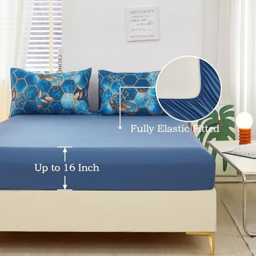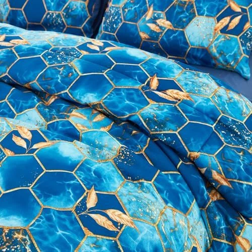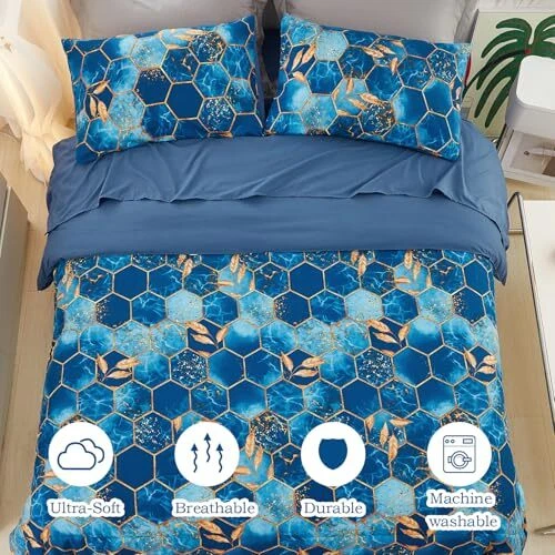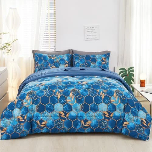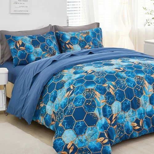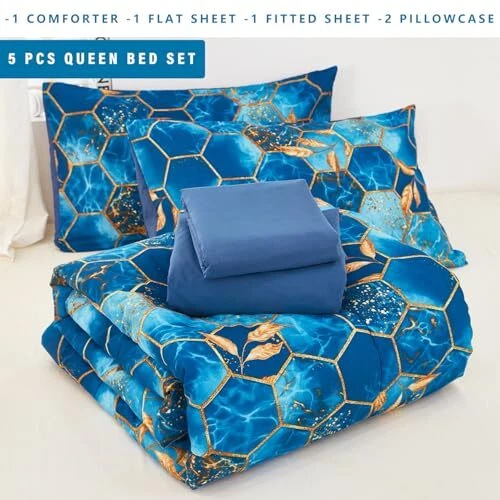 Return Policy Fast Delivery Trusted seller Marble Comforter Set Queen Size Blue and Gold Geometric Bedding Set 5 Piece Queen Bed Set, Soft Bed in a Bag with Comforter, Flat Sheet, Fitted Sheet & Pillowcase Product Description Luxurious Comfort with a Modern Twist: Elevate your bedroom's aesthetic with a modern hexagon design that adds a touch of elegance. This 5-piece queen bedding set includes the needed for a bedroom makeover. Soft Microfiber Fabric: Crafted from high-quality microfiber, our marble comforter set offers a plush feel that's as soft as it is durable. The microfiber material ensures a comfortable and cozy sleeping experience night after night. Breathable and Lightweight Design: Our comforter set is both breathable and lightweight, allowing for a peaceful sleep; Ideal for both the chill of winter and the heat of summer, this modern bed in a bag offers consistent sleeping comfort year-round, ensuring you experience just the right amount of warmth and coziness. Set Includes: Queen set includes 1 comforter 90'' x 90'', 2 pillowcases 20'' x 30'', 1 fitted sheet 60'' x 80'' + 16'' deep and 1 flat sheet 102'' x 90'', all crafted from cozy, non-pilling microfiber that is fade-resistant, so it holds up to regular use. Easy Care for Busy Lifestyles: Our Marble Comforter Set is not just visually appealing but also incredibly user-friendly. Machine washable and low maintenance, it's good for those with a busy lifestyle who still want to enjoy the luxury of a beautifully made bed. Shipping Returns Payment Shipping Shipping is FREE to all addresses other than APO/PO boxes in the lower 48 states. All our stock ships from US-based warehouses. Shipped via USPS or UPS (depending on location and package weight) Unless stated otherwise, all orders will ship within 24-72 hours of your payment being processed. Check our feedback to see the great reviews of FAST shipping we offer. Returns Seller does not accept returns Payment We currently accept payment via eBay managed payments only. Once payment is cleared, we will dispatch your shipment within 1-3 business days. Please refer to the "Shipping" tab for more information regarding shipping speed to your destination.