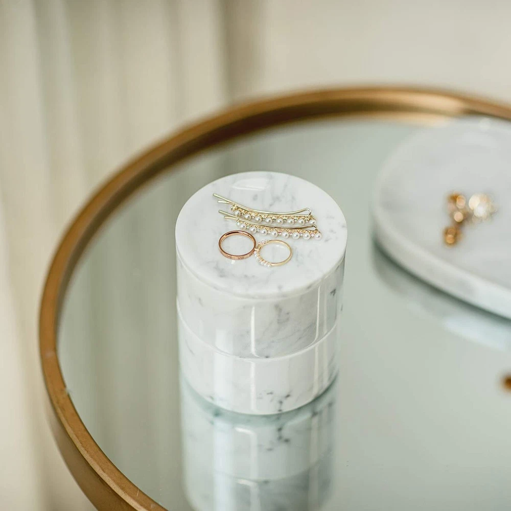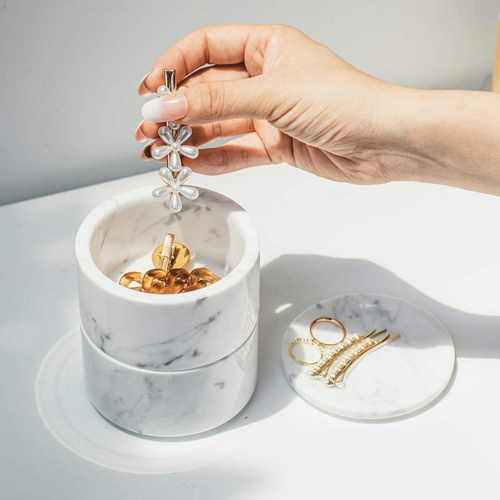 Marble Jewelry Box Organizer Two-Tier Resin Storage Container with Removable Lid for Ring Necklace Bracelet Earrings, Rings and Accessories - Buy Now with Fast Shipping! Marble Jewelry Box Organizer Two-Tier Resin Storage Container with Removable Lid for Ring Necklace Bracelet Earrings, Rings and Accessories Product Details Color: Two-layers Brand: JIMEI Material: Marble Style: Two-layers Special Feature: Jewelry Organizer,Large Capacity,Removable Recommended Uses For Product: Ring Product Dimensions: 3.54"D x 3.54"W x 4.33"H Target Audience: Women Shape: Cylindrical Finish Type: Polished Color: Two-layers Brand: JIMEI Material: Marble Style: Two-layers Special Feature: Jewelry Organizer,Large Capacity,Removable Recommended Uses For Product: Ring Product Dimensions: 3.54"D x 3.54"W x 4.33"H Target Audience: Women Shape: Cylindrical Finish Type: Polished Inner Material: Marble Number of Drawers: 2 Item Weight: 16 ounces Number of Compartments: 4 Jewelry Storage Type: Jewelry Box Number of Items: 1 Manufacturer: JIMEI Occasion: Wedding, Christmas, Birthday Mounting Type: Table Top Closure Type: Drawstring Item Weight: 1 pounds Country of Origin: China Size: Two-layers Finish: Polished Item Package Quantity: 1 Number Of Pieces: 1 Special Features: Jewelry Organizer,Large Capacity,Removable Batteries Included?: No Batteries Required?: No Date First Available: September 2, 2020 Key Features ✅ 100% marble ✅ Natural Material -- JIMEI Marble Jewelry Box Organizer is made of superior Italian Carrara Marble, the color and texture of each box is different, unique of natural, and gifted with expert crafting and optimizing procedure. ✅ Easy Storage -- JIMEI jewelry organizer is with unique space-save single layer/ two-tier design and removable box & lid. You can place the jewelry organizer any style as you like, stack them , separate them, or place the bowls side-by-side, keeping your favorite jewelry in a more funny way. ✅ Multi-Functional And Large Capacity -- Perfect to store jewelry like rings, earrings, bracelets, necklaces, brooches, also great for hair ties, hair pins and other small personal adornments. And it is good for storing nuts, candy, cookies, coffee beans, chocolates, trinkets and more. It is also a good helper for kitchen storage, which can be used to store spices and seasonings. ✅ Versatile & Expandable: JIMEI Jewelry Box s lid is also made from marble and doubles as a display tray that can be used to sort or display your jewelry. Expand your options by pairing the JIMEI Jewelry box. Elegant design shows a graceful and artistic feeling in your home. ✅ Durable & Easy to clean -- Durable marble material, easy to clean, Most parts of the box are hand polished. Marble texture may be different as they are manually poured. Product Description