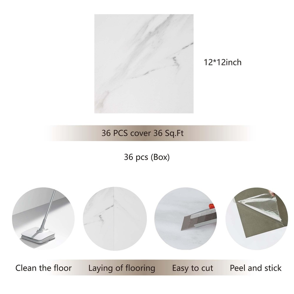 peel and stick marble floor tile 12" W x 12" L x 0.05" T36-Pack DIY waterproof vinyl flooring for Bedroom, Kitchen, Living Room,White Marble,36 Sq.Ft 【About color】: White Marble,There may be color differences when displaying this product on different computers and mobile phones. To save you time, it is recommended to order one item for first order to confirmation the color. 【Excellent Quality】:Peel and Stick Vinyl Flooring Tiles are high-quality, the wear, scratch, and abrasion-resistant properties ensure longevity, while the high strength guarantees no expansion and stability. 【Dimensions】: Each peel and stick floor tile measures 12 x 12 inches and 1.3mm thick. Therre are 36 tiles per box, which will cover 36 square feet. 【Easy Diy】: Vinyl flooring is peel and stick, very easy to install. No additional adhesives or complicated tools are needed, just peel off the backing and stick it to a clean and dry surface, saving your time and energy. 【Multi-Functional】: These self-adhesive peel & stick tiles are ideal for bathrooms, kitchens, dining rooms, and bedrooms, adding warmth and character to any space. And the peel-and-stick floor tile is an excellent choice for both renters and homeowners. 【About 】's product line, especially vinyl flooring products, stands out in the market with its diversity, technological innovation, and environmental characteristics. The realistic wood grain texture, waterproof design, easy installation, and diverse aesthetic choices of the product meet the needs of modern consumers.