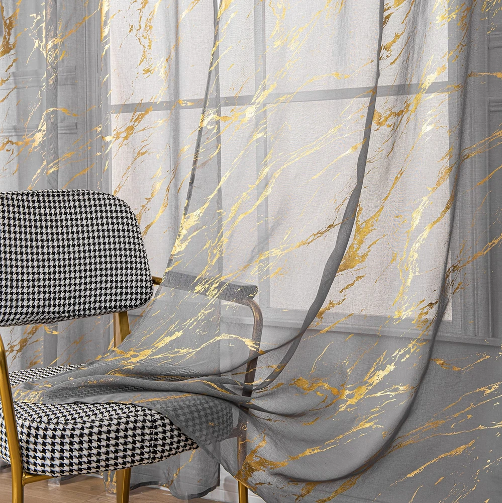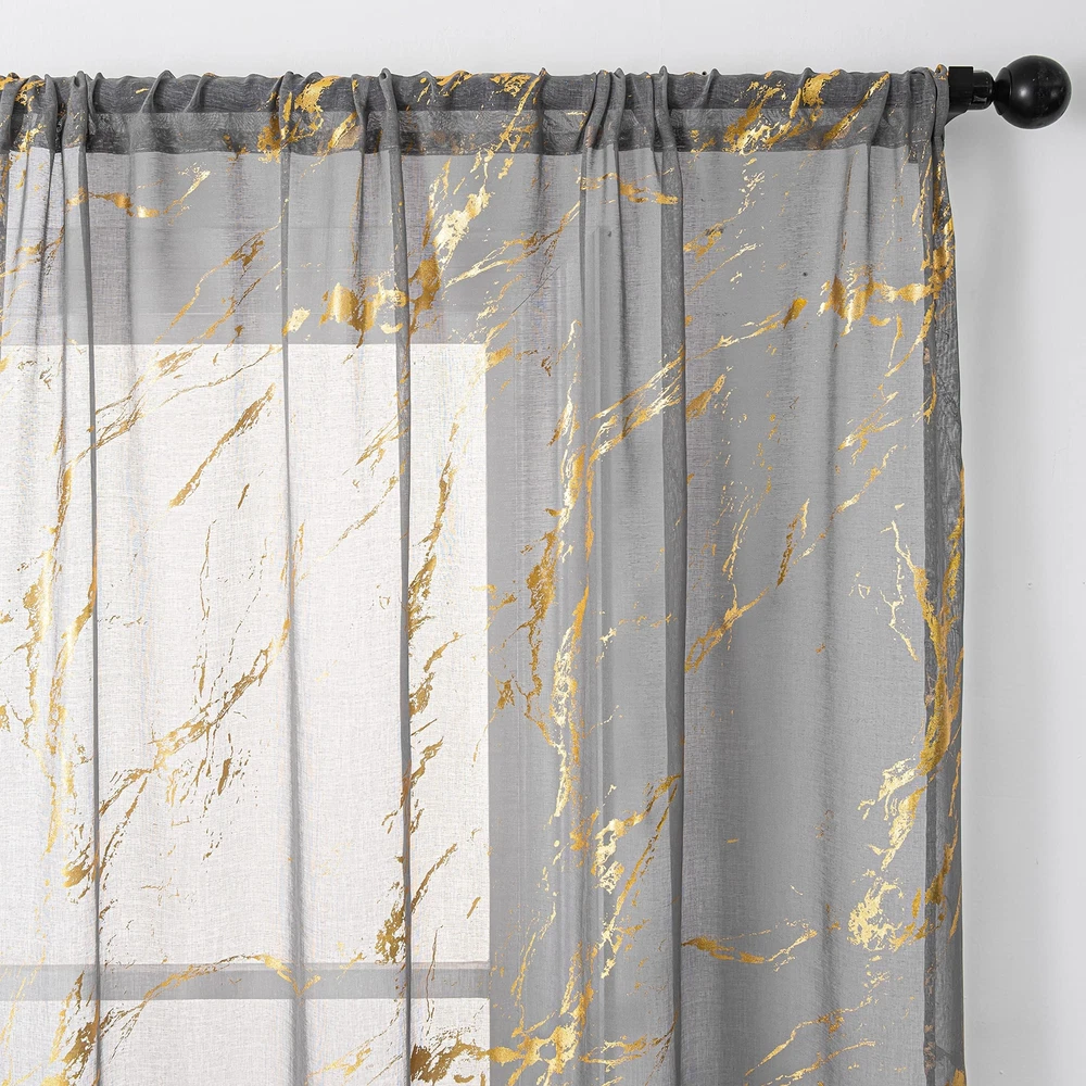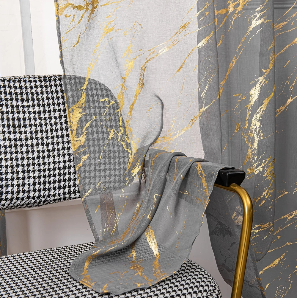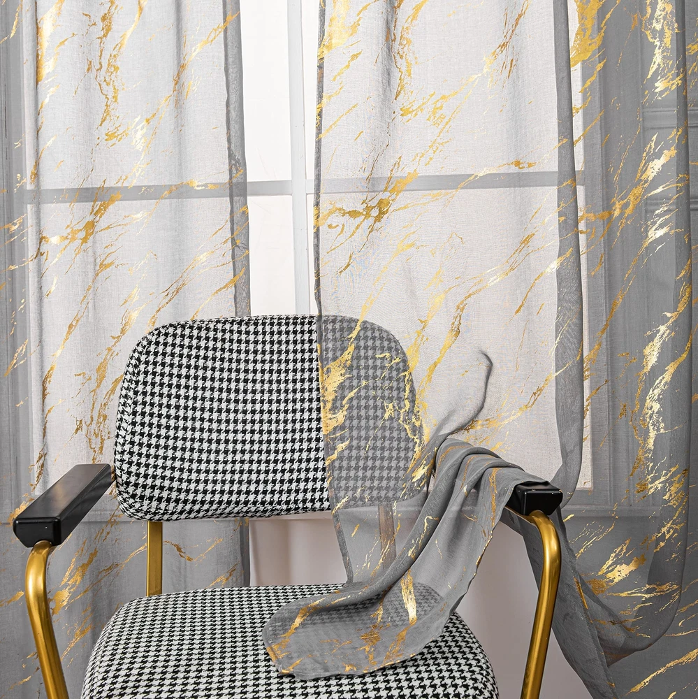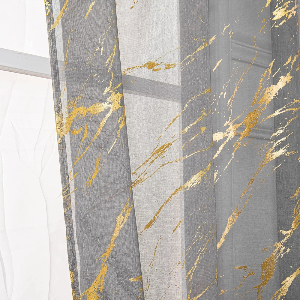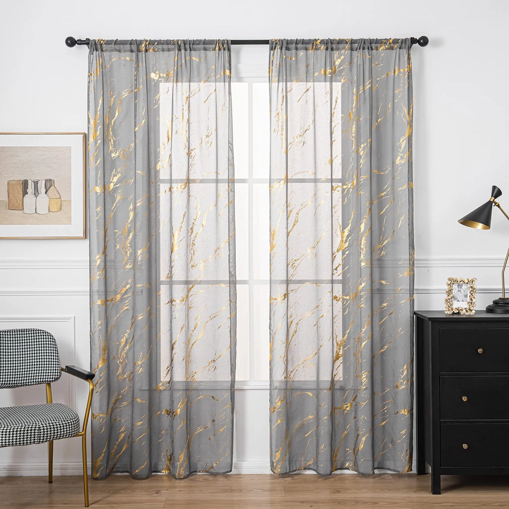 【Ready-Made】sheer curtains are made of 100% high quality polyester fabric. package included 2 panels, each panel measures width 52 inch by length 84 inch.Top 3" rod pocket design fits the most rod, easy to hang up. 【Gold Foil Print】These fancy sheer curtains designed with bronzing foil printed marble pattern which brings modern and fashionable feelings to your room. 【Sheer Privacy】These sheer curtains keep your privacy while allowing some light to filter through. Also it is airy breathable and let the fresh air filled in your house. 【Multi Occasions】Luxury look with a bit tropical stylish. They could be decorated in your bedroom, living room, dinning room, kitchen, room, office ,and Halloween decor etc. 【Easy Care】: Machine washable in cool water, recommend hand wash. gentle cycle, do not bleach, can be ironed at low temperature. Please tell us via if you have any problems about these products.