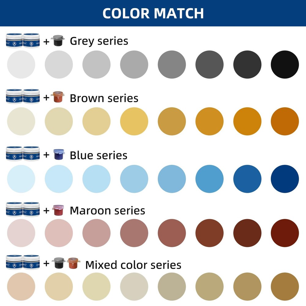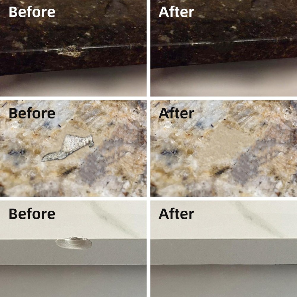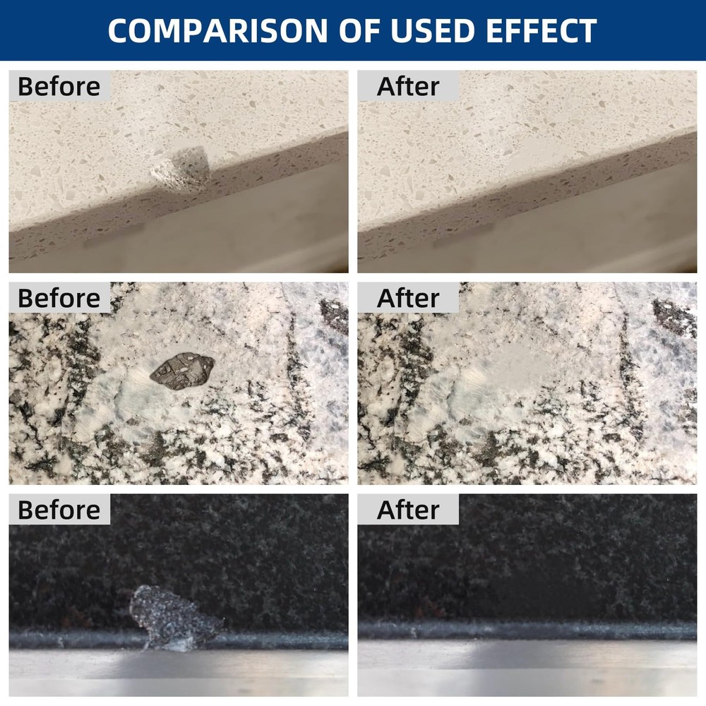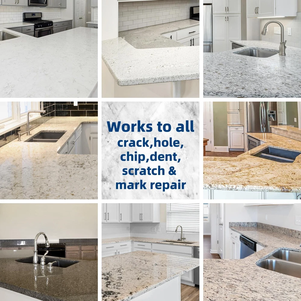 Marble & Granite Repair Kit is a multi-functional repair kit. It can be mixed in many different colors, cured very hard firm, and has the effect of waterproof plugging. This product can be used to repair dents, chips, fragments, deep scratches, cracks, suitable for ceramic tiles, granite, quartz countertops, marble, artificial stone, ceramics, enamel, acrylic, porcelain, fiberglass. It can be used to bond fragments and broken parts. Most importantly, it will help you save tons of money instead expensive professional repairs. Versatile Porcelain Repair Kit - It’s not only great for porcelain tile repair, also use it for granite countertops repair, Quartz Countertops repair, ceramic sink repair, marble repair, acrylic bathtub repair, fiberglass shower, porcelain dinnerware, travertine, limestone, slate, sandstone etc. Waterproof and hard as porcelain after curing - The product will become very firm and hard after 12 hours if the part A and part B are mixed well in a ratio of 1:1. It can be used to repair chips, holes, nicks, pits, deep scratches, defects, cracks, dents, and adhesive fragment. Perfect Color Match - You can make a lot of different colors with the color gels we provide: white, beige, arctic, cream, dune, biscuit, almond, linen, brown, bone, hourglass, ice gray, cashmere, thunder gray, black, blue, maroon, red etc. Our products are repaired without traces. You don't need to add other paint on the surface. Environmentally friendly and safe - Marble and Granite Repair kit uses environmentally friendly materials formula without harmful substances, which is harmless to the human body and the environment. During use, no irritating odor is generated, ensuring the health and safety of users. Moreover, this repair adhesive will not release harmful substances after curing, meeting environmental protection standards, so users can use it with confidence for bathtub repair at home. Your satisfaction is our pursuit - Any product-related problems are welcome to , we will do our best to serve you!
