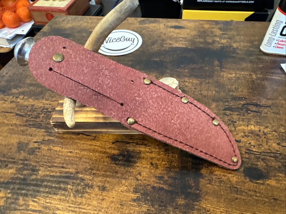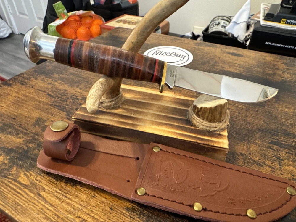 The Marbles MR302 fixed blade hunting knife features a stainless steel blade with a plain edge, measuring between 3.5 and 4 inches. This ambidextrous knife comes in a silver color and includes a Marbles sheath. Please note that the box is not included with this collectible item.