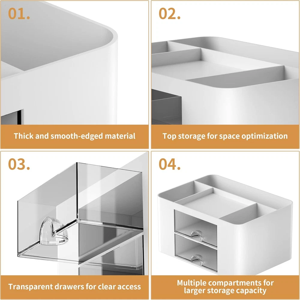Marbrasse Pen Organizer with 2 Drawer, Multi-Functional Pencil Holder White Description Features: 【Enough Capacity】Set of 3 compartments pen holder, 1 top tray, 1 notebook holder, and 2 drawers which have enough storage to allow for office supplies organization. Large capacity, multifunction help you arrange the desk accessories and stationaries clean and tidy.The best and safest storage option for you. Perfect Size:7.6*5.5* 3.9inch 【Practical Desk Caddy】This Ideal desktop storage box is practical for organizing and categorizing small office essentials like iPads, pencils, markers, scissors, sticky notes, notebooks, paper clips, and more, enabling you to maximize your workspace and achieve a more tidy and orderly desk appearance 【Convenient And Multifuction】This Desk Caddy is no installation required not only perfect for storing your desktop stationery and many other desk widgets but also great for storing your makeup brushes, nail polishes, lipsticks, and other small personal items sorted by type. The transparent drawer makes it way easier to find what you need! and You can put any other daily necessities on the organizer, It helps you keep your stuff organized 【Premium Material】This storage drawer organizer is crafted from durable ABS plastic, ensuring its strength and solidity for long-term use. The smooth operation of its drawers allows for easy opening and closing. Additionally, its waterproof design makes it effortless to clean, maintaining its pristine appearance over time 【Best Choice】The all-in-one desk pen organizer be certain to bring our customers more convenience in the office and be popular in our daily life. If you have any questions, please feel free to contact us and we'll help to solve it in 24 hours. You take NO RISK by ordering today Product Details: Specific Uses For Product: Stationery Material: Plastic Special Feature: 2 Drawer Color: White Brand: Marbrasse Finish Type: 表面未经处理 Product Dimensions: 8.2"D x 4.2"W x 6.3"H Shape: Rectangular Package Type: FFP Number of Items: 1 Manufacturer: Marbrasse Item Weight: 10.6 ounces Item model number: Pen Holder 2 Drawer-White Material Type: Plastic Manufacturer Part Number: Pen Holder 2 Drawer-White Specific Uses For Product: Stationery Material: Plastic Special Feature: 2 Drawer Color: White Brand: Marbrasse Finish Type: 表面未经处理 Product Dimensions: 8.2"D x 4.2"W x 6.3"H Shape: Rectangular Package Type: FFP Number of Items: 1 Mounting TypeItem Weight: Tabletop Mount0.66 Pounds Number of CompartmentsUnit Count: 41.0 Count Handling We will ship all orders within 3 business day of payment. Delivery We take pride in offering fast and reliable delivery for your orders! We are committed to getting your products to you as quickly as possible. Generally, we would like to inform you that all orders will be delivered to you within 1-3 business days after processing.However, in some cases, delivery times may vary depending on the buyer's location. Especially in remote or rural areas, the expected delivery time may be extended. In such situations, we do our best to ensure that your order reaches you as quickly as possible.If there are any delays, we will be happy to contact you to explain the situation. Our goal is to enhance your satisfaction with our fast delivery times. We work diligently to ensure that your order arrives safely.Trust us and enjoy our speedy delivery! Return Policy All items qualify for returns within 30 days of receipt. Buyer is responsible for return shipping on any item that is not damaged. Feedback We take our reputation seriously, we buy and sell online, so we understand the value of trust. If you are unsatisfied with your order, please contact us and we will work with you to resolve it to your satisfaction.