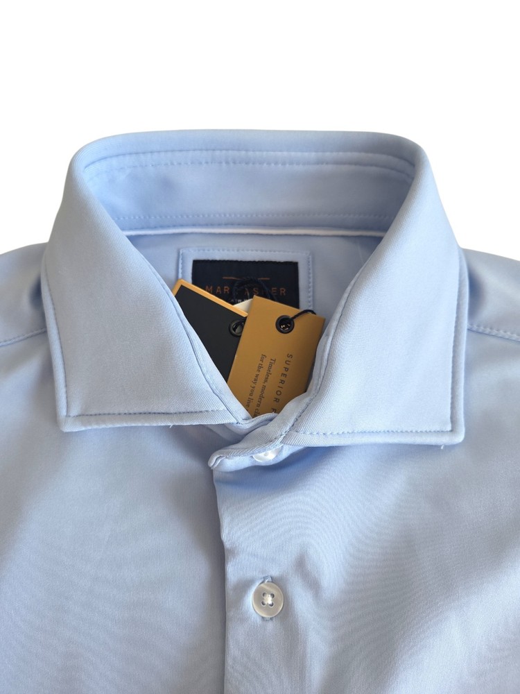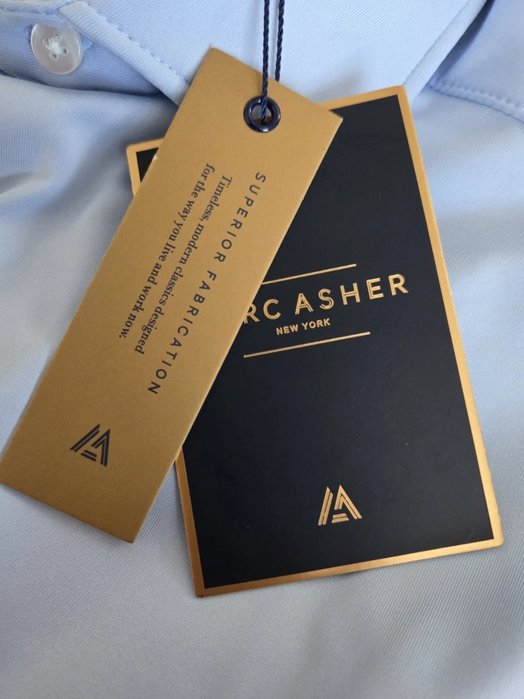 The Marc Asher New York Men's Blue Long Sleeve Dress Shirt is a classic and formal piece perfect for business occasions. Made from a blend of polyester and cotton, this woven shirt features a spread collar and button closure. The light blue color adds a touch of sophistication, while the long sleeves and barrel cuff detail give it a stylish and polished look. Ideal for men in size M, this dress shirt is a versatile and timeless addition to any man's wardrobe.