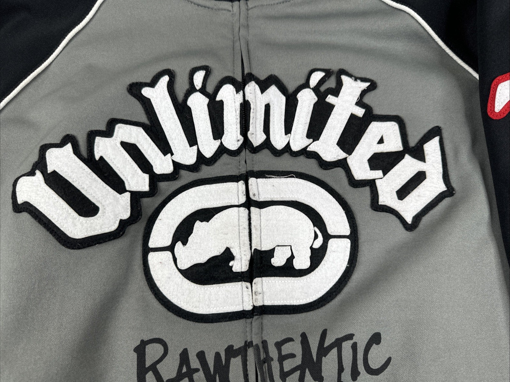 The Marc Ecko Unltd. Vintage Y2K Raw-N-Uncut 72 Full Zip Jacket in men's size XL is a stylish and edgy bomber jacket made from a cotton blend outer shell with a polyester lining. Featuring a solid black & gray color scheme, this casual jacket has a vintage appeal with logo accents. The full zip closure and regular fit make it perfect for winter, fall, and spring seasons, ideal for walking and everyday wear. Easy to care for with machine washable instructions, this jacket combines classic style with modern functionality for a versatile and on-trend addition to any wardrobe.