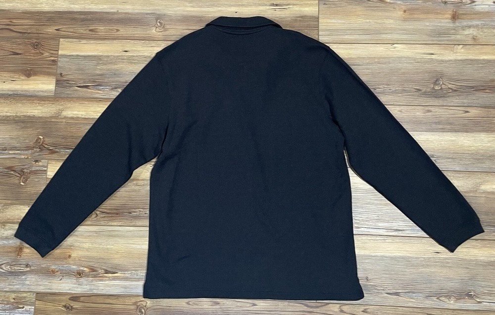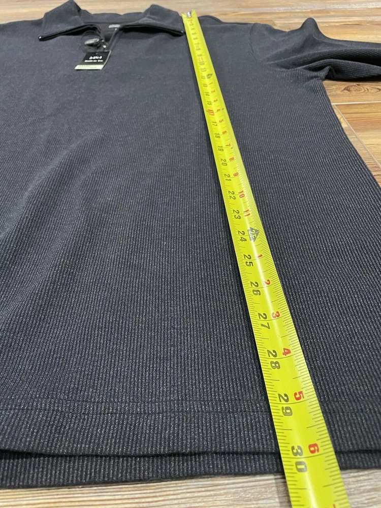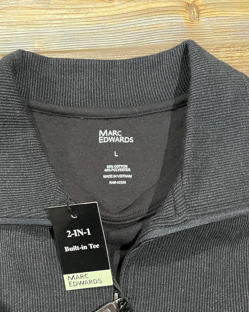Elevate your wardrobe with this stylish Marc Edwards sweater, perfect for any fashion-forward man. The sweater features a solid pattern with a tight-knit fabric type, long sleeves, and a mock neck. It comes in a size L and is made of a comfortable blend of polyester and cotton, which makes it machine washable for easy care. The black and dark gray color combination gives it a sleek and modern look, while the ribbed accents add a touch of texture. The sweater is designed with a regular fit and a 1/4 zip feature for added style and convenience. This pullover is perfect for any occasion, and it's a must-have addition to any man's wardrobe. New with tags! Marc Edwards 1/4 Zip Sweater 2-in-1 Built in Tee Long Sleeve Men’s Size Large Black and Dark Gray Flat measurements Underarm to underarm 26 inches Length from shoulder down 29 inches