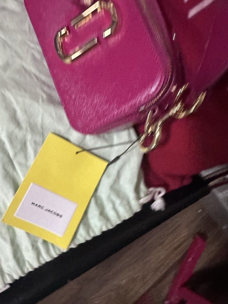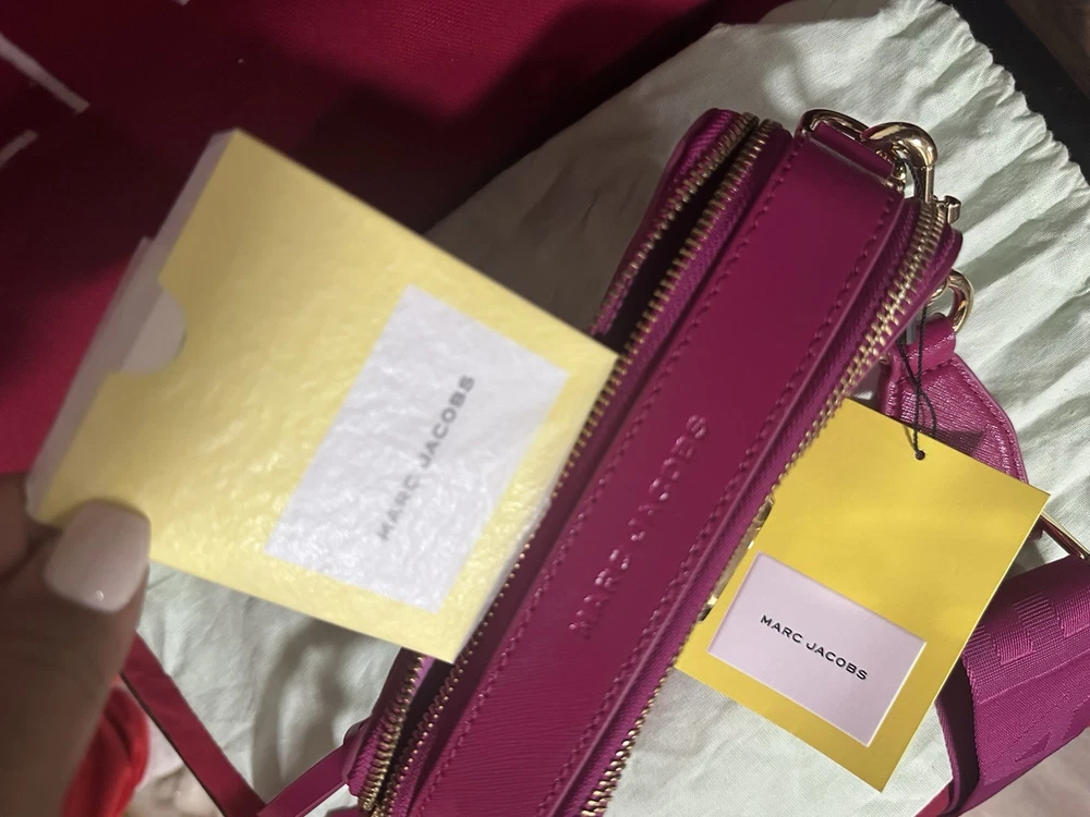 This is a Marc Jacobs The Snapshot DTM camera bag in saffiano leather with a tonal logo webbing strap.