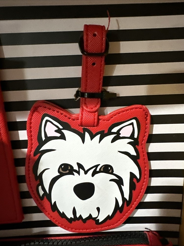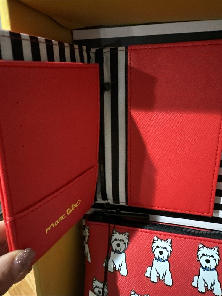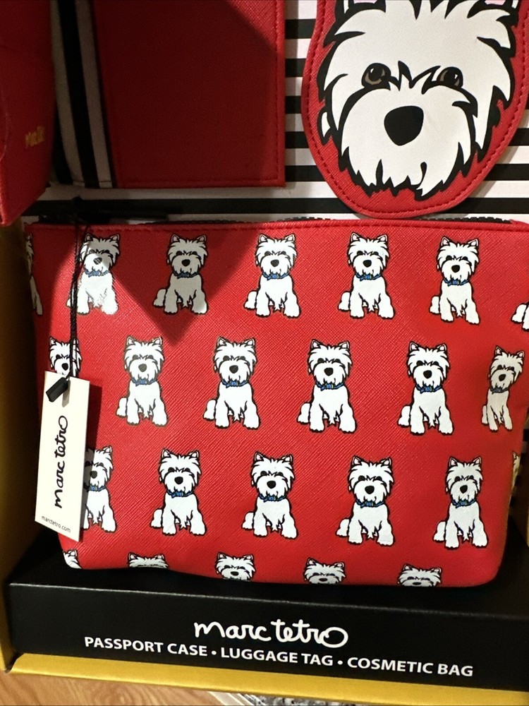 The Marc Tetro 3 Piece Gift Set features a cosmetic bag, luggage tag, and passport holder, all showcasing a charming Westie dog design. The set is crafted with 100% PVC exterior material in a coated finish, accented with a black and white fabric lining. The red exterior color complements the signature logo and zipper accents. This small-sized gift pack is ideal for travel or casual use, adding a touch of designer flair with its Westie dog motif and credit card organizer feature. Perfect for West Highland Terrier enthusiasts or those who appreciate unique, stylish accessories.