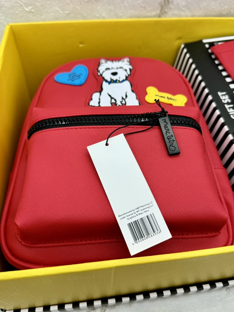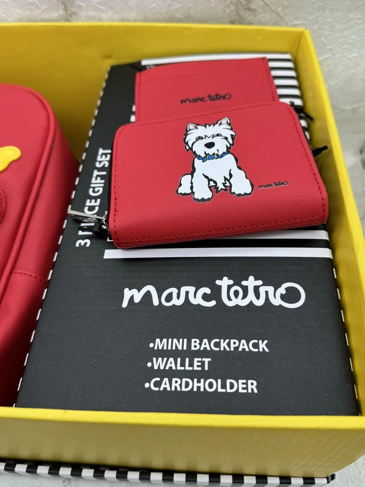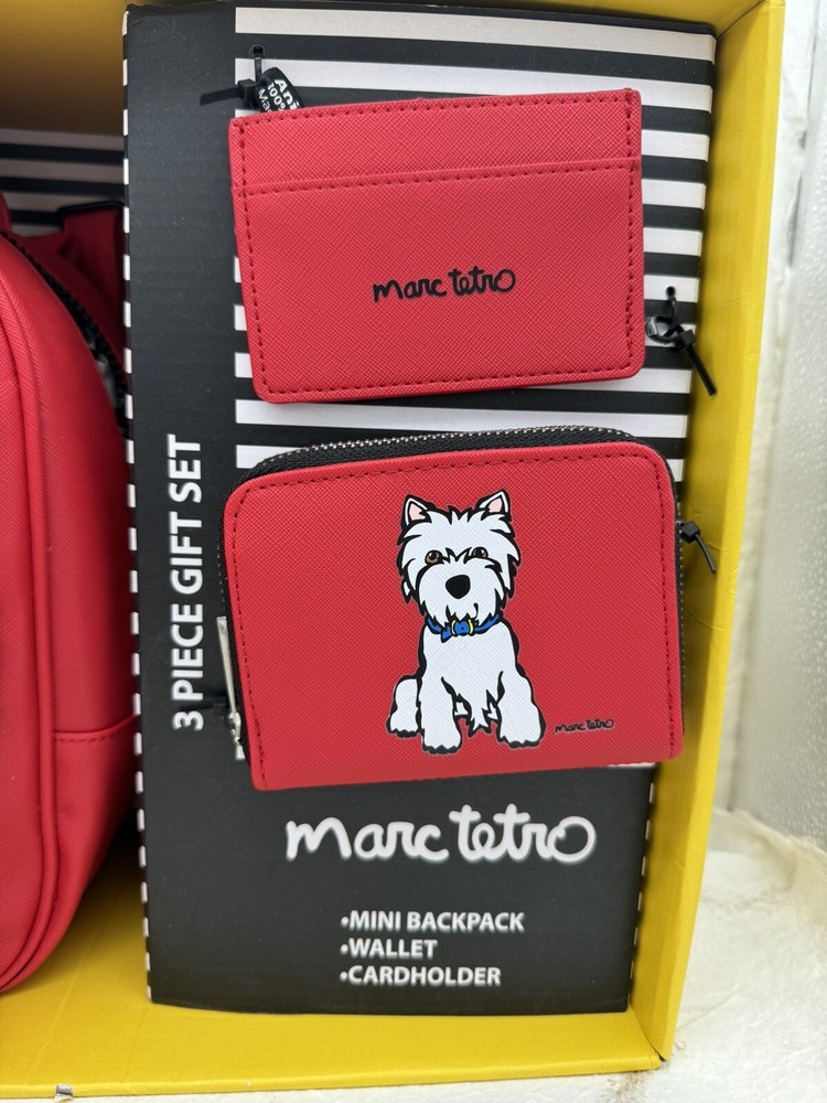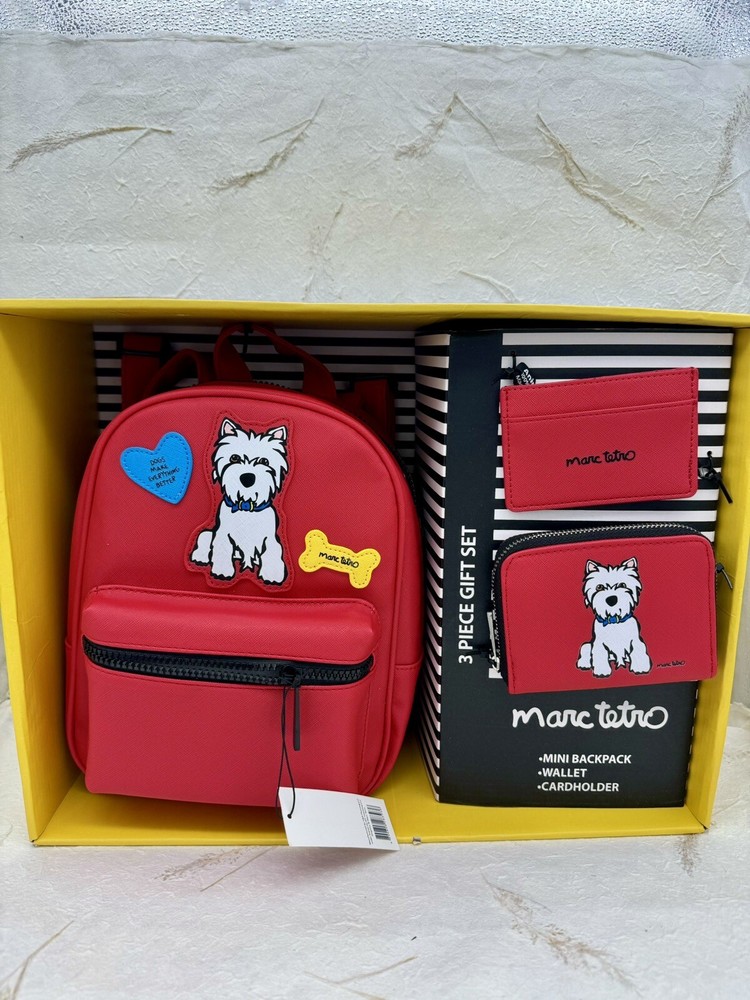 🌸 Marc Tetro Westie White Dog Backpack, wallet, and card holder 3 piece Gift Box SET! 🌸 The super popular and highly sought out Adorable Marc Tetro and the dog collection line 🌸 Hard to find and great for you or as a gift to any dog lovers there! Would make a wonderful Valentine’s Day gift for a loved one. 🌸🌸 DESCRITION: White Westie Dog Design Staffiano Synthetic Leather 🌸 1. Zip wallet, 5”x 4” 🌸 2. Matching mini backpack: zipper closure, small front pocket, bigger pocket with inner zipper pocket and regular pocket inside, adjustable straps, bag measures 10" length, 7.5" height and 4.5” width. 🌸 3. Card holder: 4.25” wide and 3” high. 🌸 Brand new with tags, never been used comes in gift box Gift box has a few shelf wear scuff, purchased as such, doesn't impact the item at all! 🌸 Brand new in box, never been used! 🌸 Please see photos for closer inspection and more details! Thanks for shopping 🌸