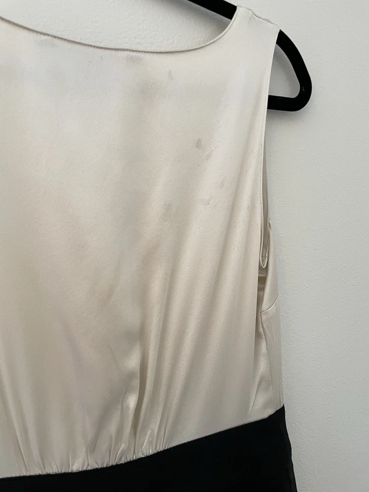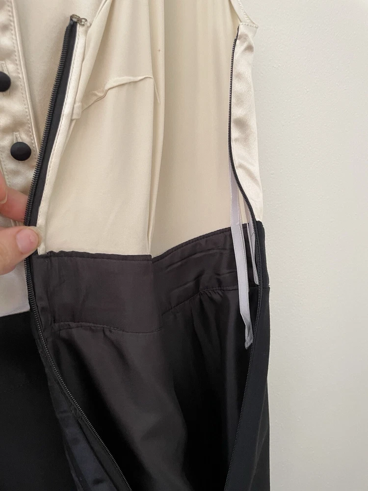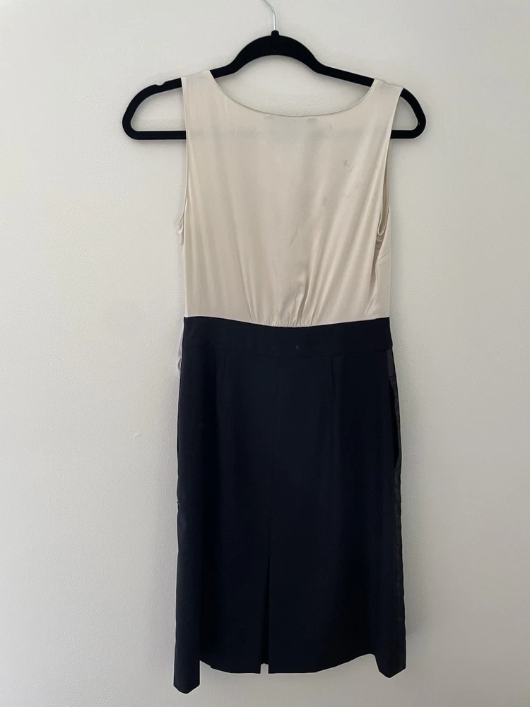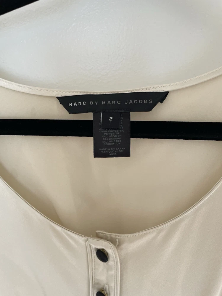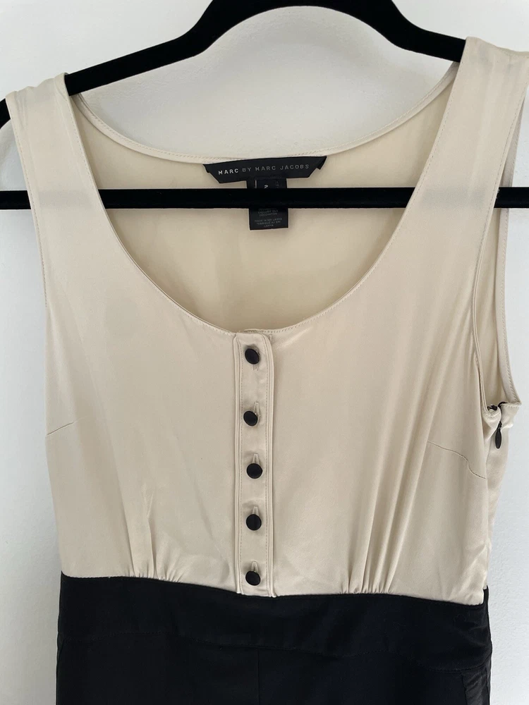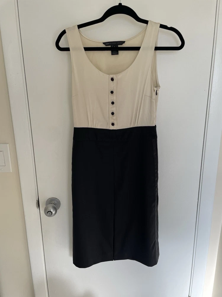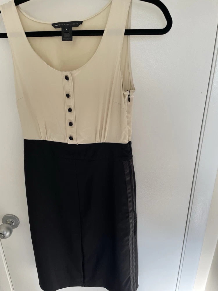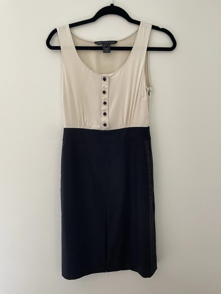 Marc by Marc Jacobs silk and wool A-Line Cocktail dress size 2 ivory and black Marc by Marc Jacobs Size 2 Silk bodice Wool skirt Button up detail Hidden zipper closure Pockets Great dress for professional attire or special occasions 13.5” waist 17” pit to pit 19” hip 38” L Great condition unworn with one small flaw. There are a few transfer/stains on the back of the silk top. Can be removed by a dry cleaner. The stitch that seals slit in the skirt is unopened so I don’t believed this was ever worn