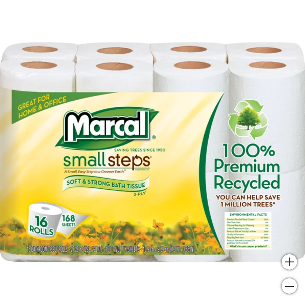 Marcal 100% Recycled Bath Tissue, 2-Ply, 168 Sheets, 96 Rolls Features: 2-Ply, 4.3" x 3.66" Sheet Size 168 Sheets per Roll 16 Rolls 293.7 Total sq ft Product Details Soft & Strong 2-Ply 100% Recycled Septic safe Whitened without using chemicals containing chlorine No added dyes or fragrances Made in USA 6 packs of 16 rolls each 168 sheets per roll