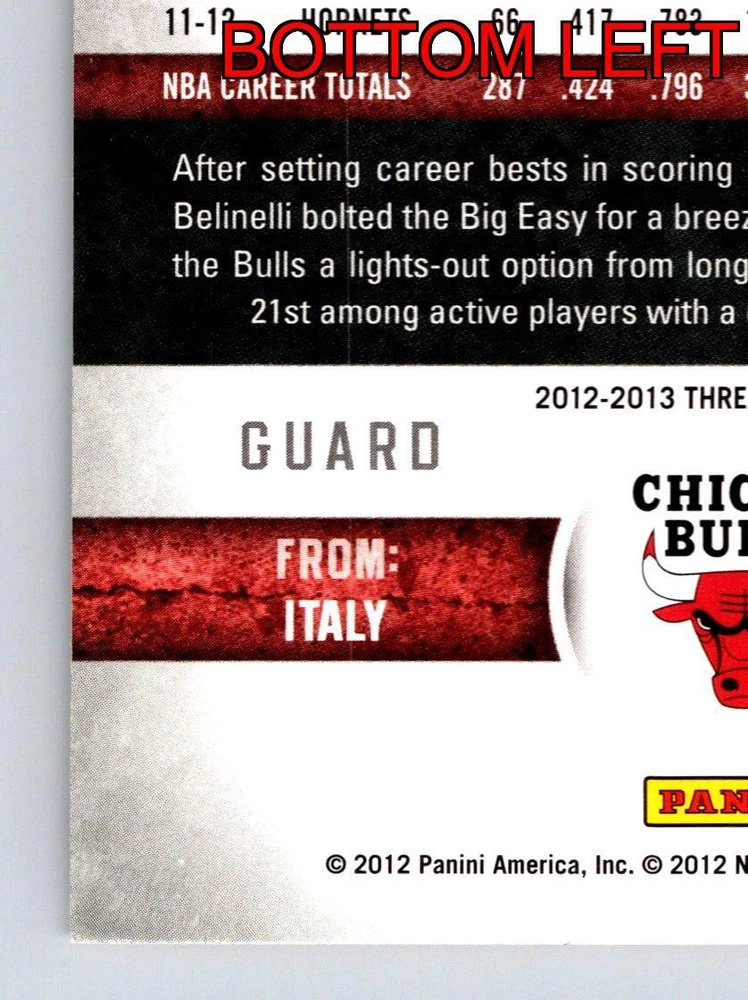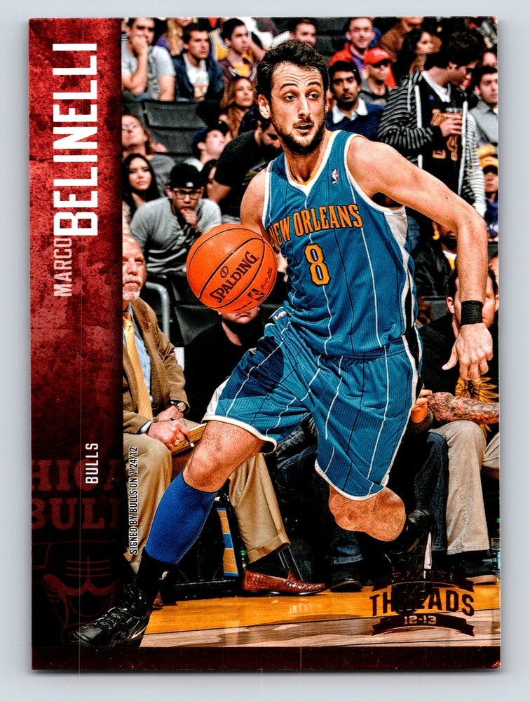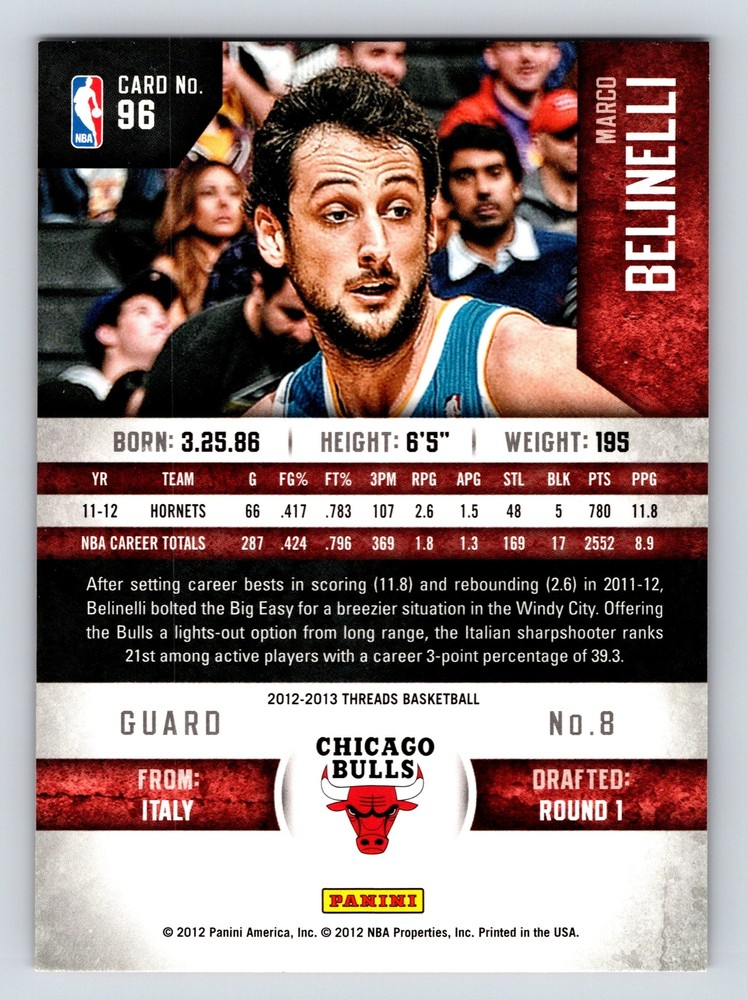 Item Description Title: Marco Belinelli Chicago Bulls Panini Threads 20122013 Card 96 Sports Memorabilia Description: This sports trading card features Marco Belinelli, a skilled guard who played for the Chicago Bulls during the 2012-2013 NBA season. Belinelli, known for his sharp shooting and strategic gameplay, brought a fresh energy to the Bulls after his successful stint with the New Orleans Hornets. Standing at 6'5 and weighing 195 pounds, Belinelli is recognized for his ability to score from long range, which placed him among the top active players in terms of three-point percentage. The card highlights his Italian roots and his role as a significant contributor to the Bulls' dynamic offense. The Panini Threads series is celebrated for its quality and design, making this card a desirable addition for collectors and fans. The front of the card captures Belinelli in action, showcasing his focus and athleticism. The reverse side details his stats and career trajectory, offering a comprehensive look at his impact in professional basketball. MRSP: $5.99 Sport: Basketball Player/Athlete: Marco Belinelli Season: 2012-2013 Manufacturer: Panini Parallel/Variety: Unknown Set: Panini Threads Basketball 2012-2013 Team: Chicago Bulls League: National Basketball Association (NBA) Card Number: 96 Counter: 399 Folder: BASKETBALL1224002