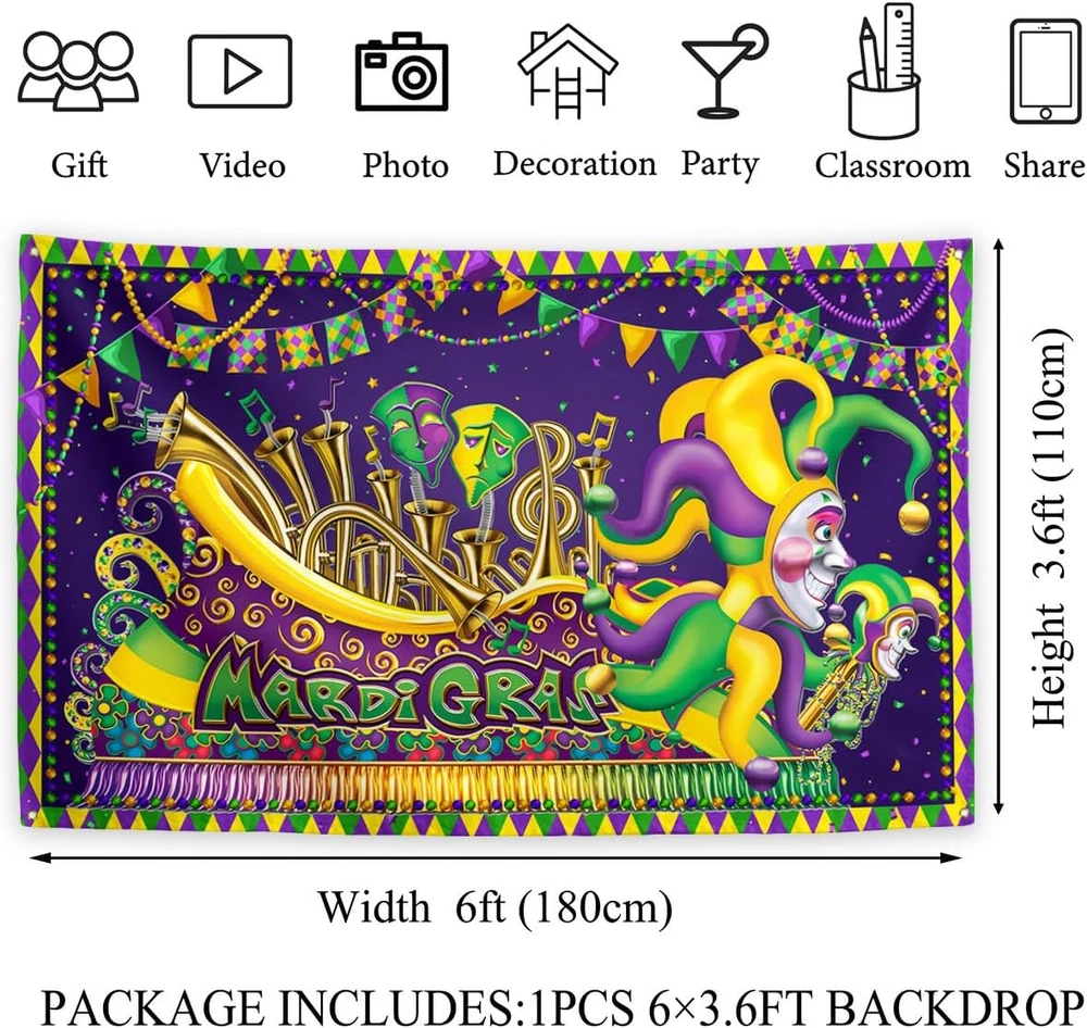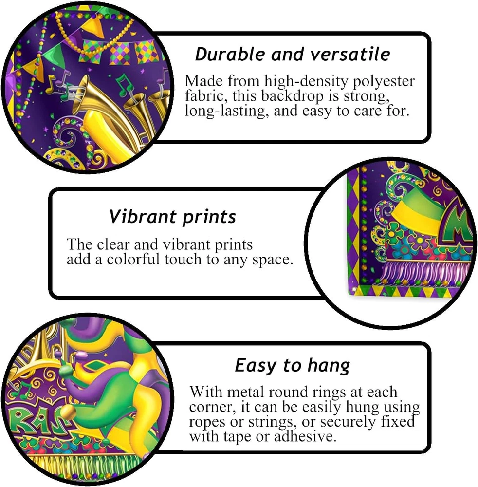 Store New Arrivals Add to Favorite View Feedback Contact Fast deliveries to the customer's home Quality customer service John Make the customers happy! Mardi Gras Decorations New Orleans Brazi Carnival Backdrop Fat Tuesday Banner Masquerade Decor Mardi Gras Decorations for Home Party Description [Material]:This backdrop is made of high-quality material,100% polyester fabric, which is not easy to wrinkle or fade,and can be reused. [Size]:Our backdrop size is approximately 71 × 43 inches(180cm×110cm), large enough to attract people's attention. [Package listing]:Only 1pcs backdrop is included,Backdrop Stand or Clips are Not included. [Easy to hang]:Our background fabric can be hung anywhere you want. There are 4 metal grommets in each corner for easy hanging. Our background fabric is light enough to be hung with tacks, tape, or jute rope, making it perfect for indoor or outdoor use. (Note: Tools such as tacks, tape, or ropes are not included.) [Occasion]:Used for photography, photography, studio, home decoration, wallpaper, wall background scenes or decorations. Also suitable for various holiday parties and gatherings, adding a festive atmosphere. Used for photography, photography, studio, home decoration, wallpaper, wall background scenes or decorations. Also suitable for various holiday parties and gatherings, adding a festive atmosphere. Item model number banner Color B-114 Product Dimensions 71"L x 43"W Item Weight 4.8 ounces Occasion Mardi Gras ABOUT US We offer the best prices around on high quality products. Our E-store includes media such as books, movies, music and games while offering electronics, toys, sporting apparel, clothing, tools, general home, garden items and more. SHIPPING We are always working hard to ensure your package arrives as soon as possible. Please understand that some factors like weather, high postal traffic, and the performance of shipping companies are outside of our control. We offer free shipping to the lower 48 states and ship within 2 business days of payment, usually sooner. We do not accept P.O. Boxes. Please provide a physical address. For shipping outside of the continental USA, we only use eBay's Global Shipping Program. The item is shipped to KY and then sent to the rest of the world. International customers are responsible for all duties and taxes. Continue to 'check out' to calculate costs for shipping the item to your country. Messages regarding eBay's Global Shipping Program MUST be directed at eBay EXCLUSIVELY. RETURNS We offer a 30-Day Return Policy on items in which you are not completely satisfied with. You have the option of a full-refund or an exchange of the item. No returns are available on items shipped outside of the USA PAYMENT We accept PayPal. CONTACT US This page content is yet to come Please ad us to your favorite seller and visit again later Thank You CUSTOMER SATISFACTION We try our very best to make sure every customer is completely satisfied. If there's a problem, message us! We're happy to help. WE ACCEPT