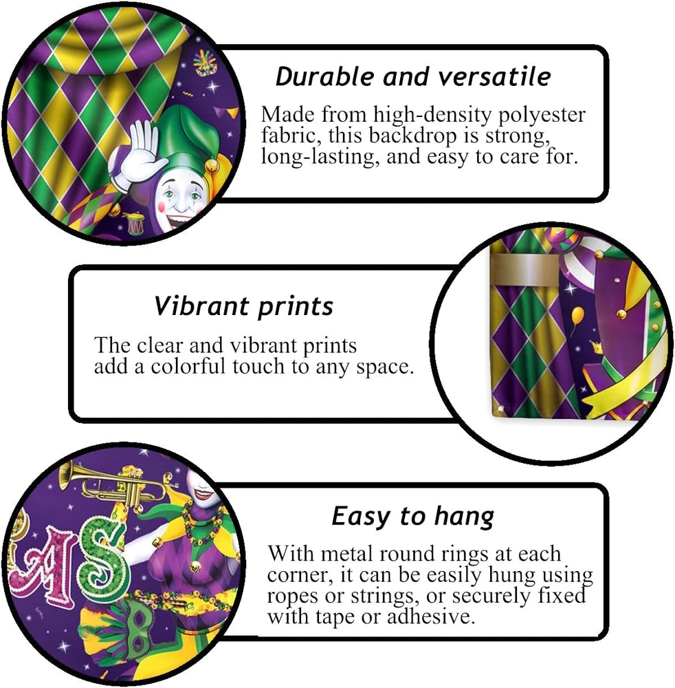 Store New Arrivals Add to Favorite View Feedback Contact Fast deliveries to the customer's home Quality customer service John Make the customers happy! Mardi Gras Decorations New Orleans Brazi Carnival Backdrop Fat Tuesday Banner Masquerade Decor Mardi Gras Decorations for Home Party Description [Material]:This backdrop is made of high-quality material,100% polyester fabric, which is not easy to wrinkle or fade,and can be reused. [Size]:Our backdrop size is approximately 71 × 43 inches(180cm×110cm), large enough to attract people's attention. [Package listing]:Only 1pcs backdrop is included,Backdrop Stand or Clips are Not included. [Easy to hang]:Our background fabric can be hung anywhere you want. There are 4 metal grommets in each corner for easy hanging. Our background fabric is light enough to be hung with tacks, tape, or jute rope, making it perfect for indoor or outdoor use. (Note: Tools such as tacks, tape, or ropes are not included.) [Occasion]:Used for photography, photography, studio, home decoration, wallpaper, wall background scenes or decorations. Also suitable for various holiday parties and gatherings, adding a festive atmosphere. Used for photography, photography, studio, home decoration, wallpaper, wall background scenes or decorations. Also suitable for various holiday parties and gatherings, adding a festive atmosphere. Item model number banner Color B-113 Product Dimensions 71"L x 43"W Item Weight 4.8 ounces Occasion Martin Luther King Jr. Day, Mardi Gras ABOUT US We offer the best prices around on high quality products. Our E-store includes media such as books, movies, music and games while offering electronics, toys, sporting apparel, clothing, tools, general home, garden items and more. SHIPPING We are always working hard to ensure your package arrives as soon as possible. Please understand that some factors like weather, high postal traffic, and the performance of shipping companies are outside of our control. We offer free shipping to the lower 48 states and ship within 2 business days of payment, usually sooner. We do not accept P.O. Boxes. Please provide a physical address. For shipping outside of the continental USA, we only use eBay's Global Shipping Program. The item is shipped to KY and then sent to the rest of the world. International customers are responsible for all duties and taxes. Continue to 'check out' to calculate costs for shipping the item to your country. Messages regarding eBay's Global Shipping Program MUST be directed at eBay EXCLUSIVELY. RETURNS We offer a 30-Day Return Policy on items in which you are not completely satisfied with. You have the option of a full-refund or an exchange of the item. No returns are available on items shipped outside of the USA PAYMENT We accept PayPal. CONTACT US This page content is yet to come Please ad us to your favorite seller and visit again later Thank You CUSTOMER SATISFACTION We try our very best to make sure every customer is completely satisfied. If there's a problem, message us! We're happy to help. WE ACCEPT