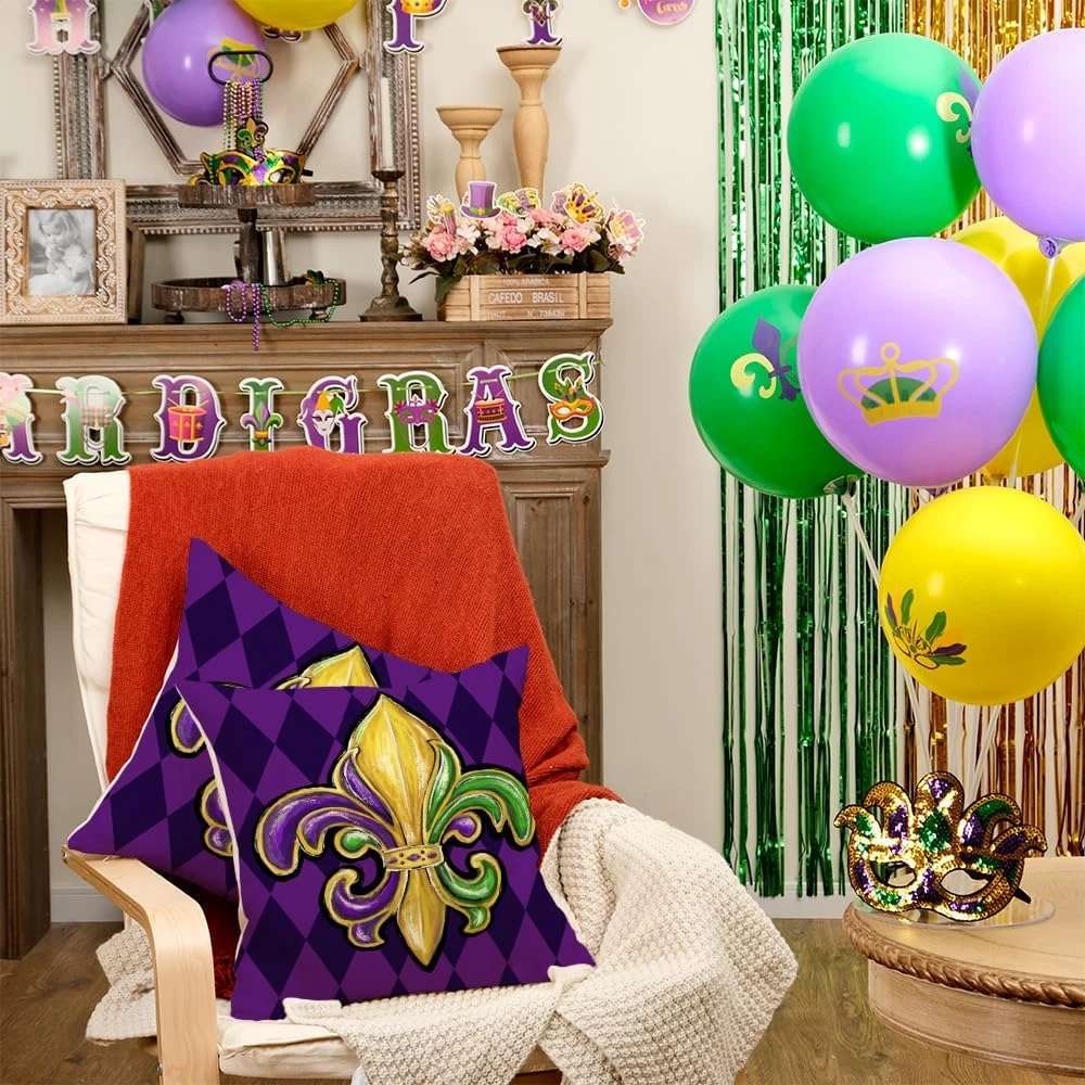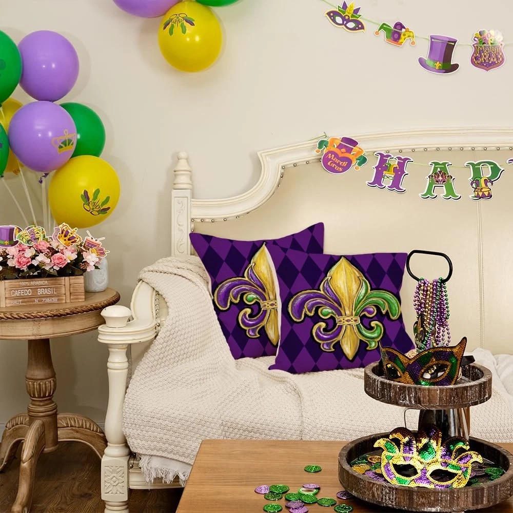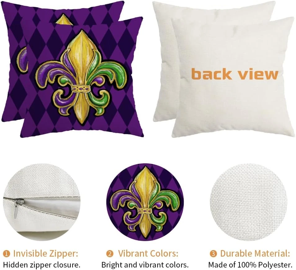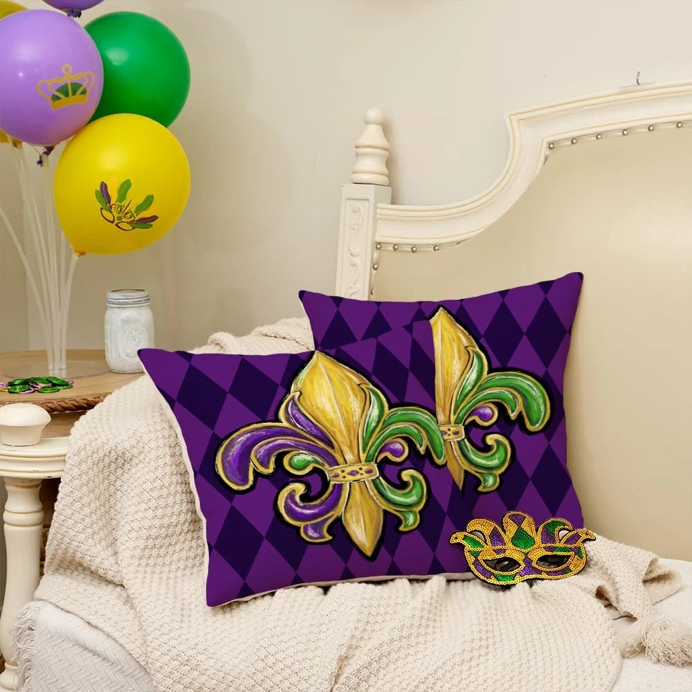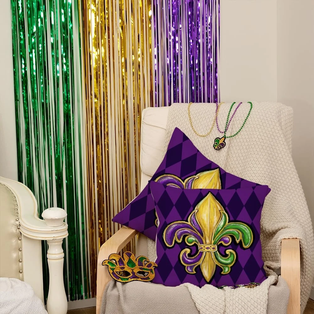 Mardi Gras Pillow Cover 18X18 Inch Fleur De Lis Beads Decor Holiday Farmhouse Pi