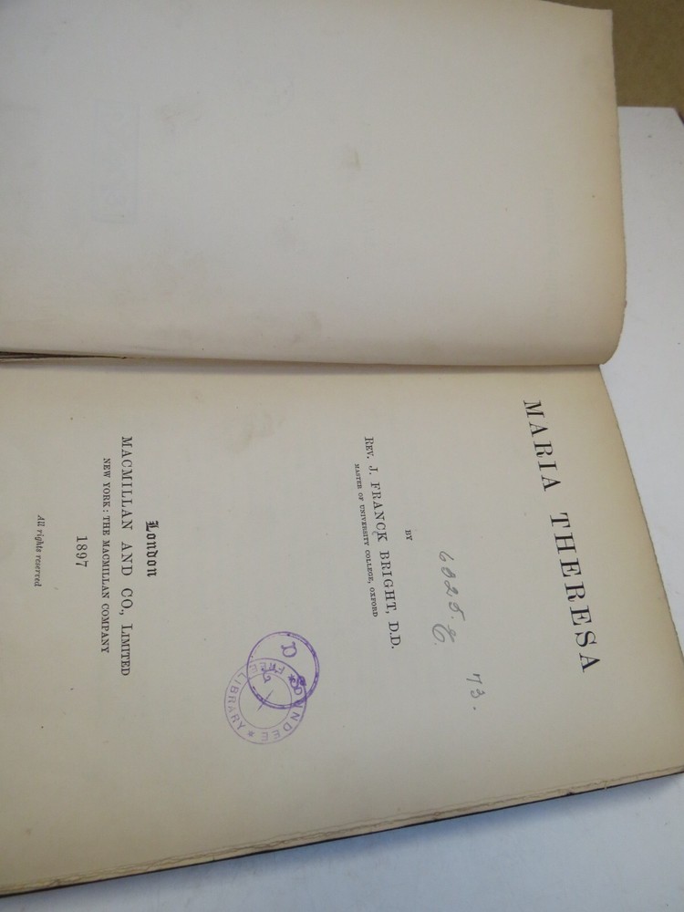 Book For Sale - Maria Theresa By Rev. J. Franck Bright 1897 Date - 1897 Author - Rev J. Franck Bright Height of book - 19.6 cm Pages - 224 Publisher & Place - London Macmillan and Co Format - Hardback Condition - Ex library book usual stamps etc. Some edge wear to boards.