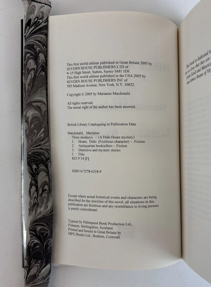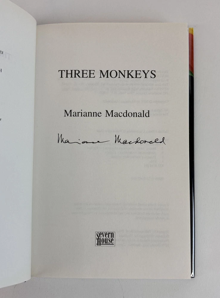 THREE MONKEYS [Signed] Author: MacDonald, Marianne Title: THREE MONKEYS [Signed] Publication: Surrey, UK: Severn House, 2005 Edition: First UK Edition, First Printing Description: Small octavo, 216 pages. In Near Fine condition with Near Fine condition dust jacket. Spine is yellow with black and red lettering. Dust jacket protected by mylar covering, price uncut: "£18.99" on front flap. Boards have mild shelving wear along spine tail. Signed flat by Marianne MacDonald on title page. Shelved in hallway. Seller ID: 1391974 Subject: Literature Welcome to the eBay store of Second Story Books! DC's Oldest Rare and Used Bookstore, Second Story Books operates two open shops in the Washington D.C. metropolitan area. We have an extensive internet presence and provide accredited appraisals member ASA. This listing was created by Bibliopolis.