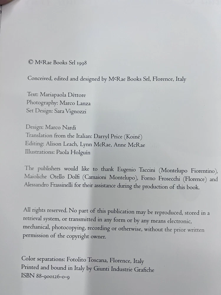 Language: English Publisher: McRae Books Item Height: 11 in Narrative Type: Nonfiction Country/Region of Manufacture: Italy Topic: Cooking, Italian Cuisine, National Cooking, Pizza Recipes Vintage: Yes Edition: First Edition Publication Year: 1998 Original Language: Italian Author: Mariapaola Dettore ISBN: 9788890012600 Type: Cookbook Features: Dust Jacket, Illustrated Item Width: 1 in Genre: Cookbooks, Food & Drink Book Series: The Italian Way Number of Pages: 120 gtin13: 9788890012600 Personalize: No Intended Audience: Young Adults, Adults Item Length: 9 in Format: Hardcover Book Title: Pizza Pane Focacce! Pizza, Bread & Focaccia The Italian Way