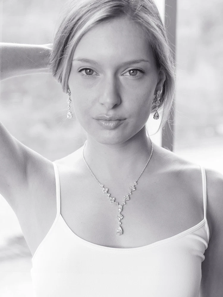 Mariell Cubic Zirconia Necklace & Earrings Bridal Jewelry Set, CZ Crystal Statement Necklace Set for Weddings, Formal Events, Mother of The Bride Product Details Is Discontinued By Manufacturer : No Product Dimensions : 19 x 0.39 x 2 inches; 1.76 ounces Item model number : 3564S Department : womens Date First Available : July 22, 2015 Manufacturer : Mariell Brand, Seller, or Collection Name: Mariell Metal stamp: Not stamped Metal: rhodium-plated-brass Material: Metal, Gemstone Gem Type: Cubic Zirconia Setting: 4prong Item Length: 19 inches Height: 2 inches Width: 0.39 inches Length: 19 inches Chain: Link Clasp: Lobster Clasp Resizable: No Number of stones: 24 Model number: 3564S Mariell's exquisite Wedding Necklace and Earrings set features a mix of pears, rounds, marquise and princess cut Cubic Zirconia stones. This glamorous bridal jewelry is guaranteed to turn heads at any special event! Seeking a fresh, contemporary wedding or high fashion special event showpiece? This set is the one! The necklace is adjustable 17" - 19" and plunges 2" at the center. The dangle earrings are 2" long. Treat yourself or someone you love to some seriously gorgeous sparkle.