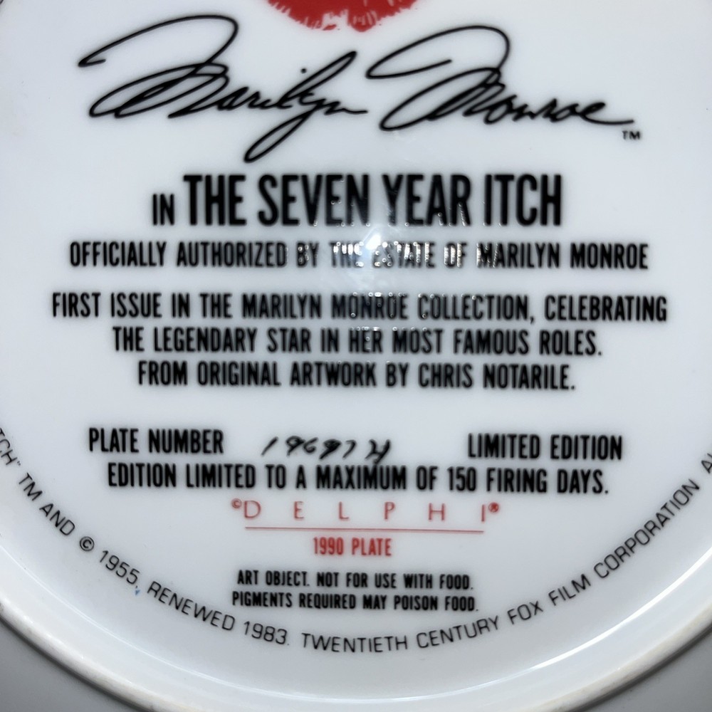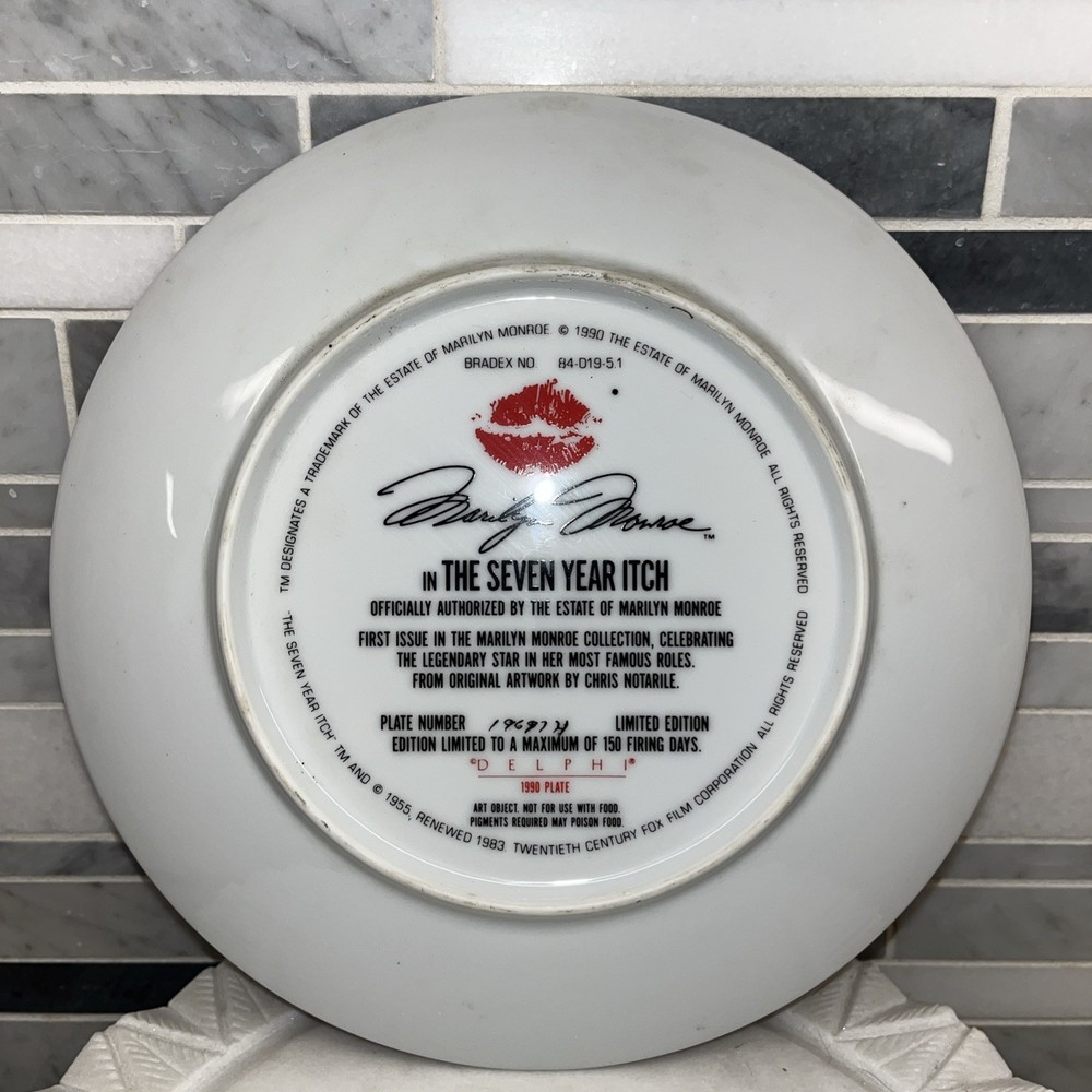 The Marilyn Monroe in The Seven Year Itch limited edition plate from 1990 by Bradford Exchange is a vintage collector's item measuring 8.5 inches in diameter. This decorative plate features a multicolor design and belongs to the American culture of the late 20th century. While it does not come with a certificate of authenticity, it is a unique piece of art pottery that pays homage to the iconic image of Marilyn Monroe in the classic film. Perfect for all occasions, this limited edition plate is a must-have for fans of vintage American pop culture.