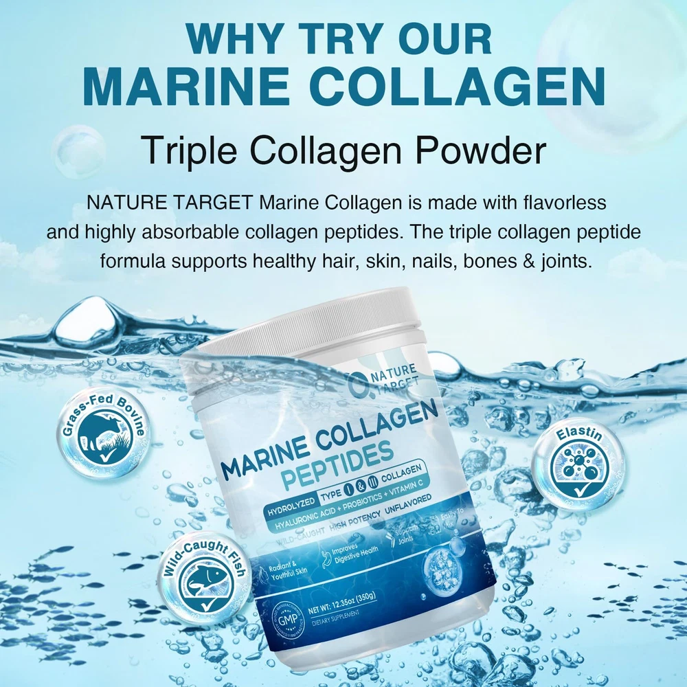Triple Collagen Formula: ’s marine collagen peptides from wild-caught fish and grass-fed bovine, are rich in Types I & III collagen. Supports skin hair and nails health. It's perfect for any lifestyle or diet, including Keto & Paleo, Vegan Glowing Skin: The main benefits of marine collagen peptides is that it makes skin look younger. It contains hyaluronic acid, which enhances skin's moisturization and elasticity. Ideal for combating aging and collagen loss, perfect for women’s beauty needs Enriched with Vitamin C & E: Our marine collagen powder includes Vitamin C for collagen formation and antioxidant support. Vitamin E boosts Vitamin C’s effectiveness eightfold. Combining these antioxidants with marine collagen enhances overall benefits Highest Absorption & Easy Digestion: Marine collagen’s small molecules ensure high bioavailability and optimal health benefits. Hydrolyzed and fortified with 10 billion probiotics for easy digestion and absorption. Soluble in hot or cold liquids Premium Quality: Our products are made in a cGMP-certified facility to ensure top quality. Free from artificial flavors, sugar, sweeteners, and preservatives. Includes a spoon for easy use—just add to your favorite drink or recipe and enjoy the benefits!