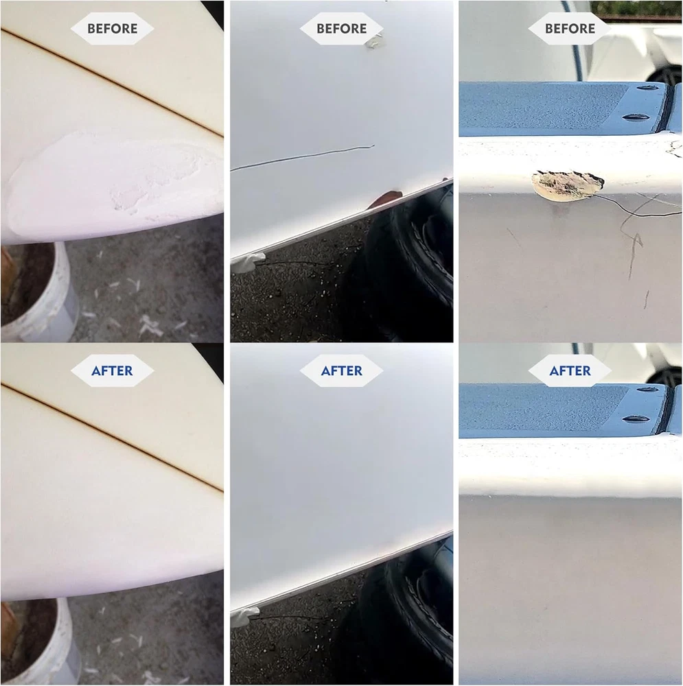 Multi-function: Our marine fiberglass repair kit is designed for the deep scratches, cracks, and holes of various water transportation devices such as repairing boats, yachts, and motorboats to ensure efficient and seamless repair effects and restore the original appearance. Excellent repair effect: This white gel coat repair kit uses high-performance epoxy fillings that have excellent anti-friction, waterproof, and ultraviolet capacity to ensure that the repair area can last long be durable under marine conditions, and maintain many years of attractiveness. Extensive applicability: Fiberglass resin and hardener kit is suitable for a variety of materials, including glass fiber, PVC, aluminum, acrylic acid, and ceramics, which can effectively fix different types of damage, and is widely used in the repair of ships and home items. This kit includes: 2 fiberglass repair kits, 1 silicone cup, 2 pairs of gloves, 1 scraper, 4 stirrers,1 push rod, and 2 sandpapers. Material safety: Our marine fiberglass resin uses non-toxic materials to ensure safety for users and the environment. If the purchased products are damaged or lacking tools, you can contact us at any time, and we will give the most effective solutions at the fastest speed. (Instruction on the box) Product Description