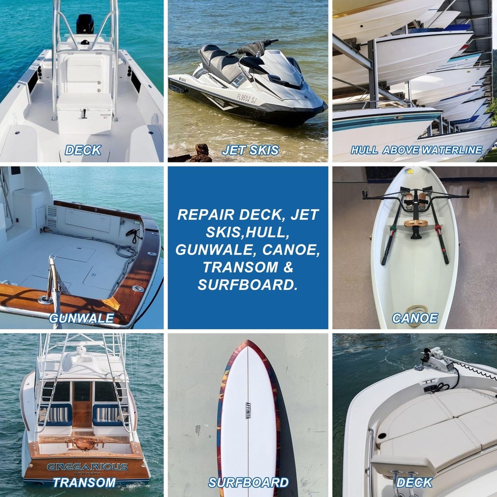 Marine Fiberglass Repair Kit for Boats Superior Damage Repair: High quality epoxy in our fiberglass boat repair kit has super adhesion, no-sag & fast cure feature, dried hard with high gloss outlook, traceless fix deep holes, chips, cracks and pits, for hulls above & below the waterline Permanent Durability: Our strong boat fiberglass repair kit resists seawater erosion, UV exposure, daily friction and even hull strike, totally seals water out, never peel, split or collapse, forever fix hull, deck, stern, maintain hull integrity and stability Fit Various Small Water Vehicles: gelcoat repair kit for boats, jet ski, yacht, wakeboard, high adhesive epoxy tightly adheres to fiberglass, acrylic, porcelain, PVC and its high gloss white color will blend well & won’t yellowing Ideal for DIY: The boat gel coat repair kit includes all tools, no primer needed, fast cure epoxy with 1:1 press head enables inevitable repair success, no prior experience is required, detailed instructions will all along the repair process! Full Trust Without Concern: If our gel coat repair kit for boats below your expectations, we will provide an intact substitute or indemnify the original value of your order, so please get in touch with us when in need