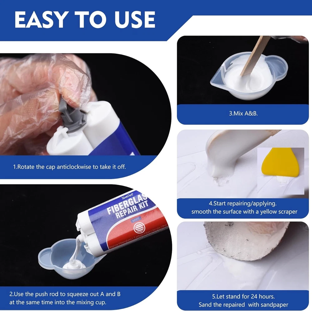 Free eBay listing template designed by dewiso.com Marine Fiberglass Boat Repair Kit, 100ml Gel Coat Repair Kit for Boats, Fiberglass Repair Kit for Boats, Epoxy Resin Glue Filler Fix Scratch, Crack, Hole, Pit, Suitable for Porcelain Acrylic(White) FREE AND FAST SHIPPING! Multi-function: Our marine fiberglass repair kit is designed for the deep scratches, cracks, and holes of various water transportation devices such as repairing boats, yachts, and motorboats to ensure efficient and seamless repair effects and restore the original appearance. Excellent repair effect: This white gel coat repair kit uses high-performance epoxy fillings that have excellent anti-friction, waterproof, and ultraviolet capacity to ensure that the repair area can last long be durable under marine conditions, and maintain many years of attractiveness. Extensive applicability: Fiberglass resin and hardener kit is suitable for a variety of materials, including glass fiber, PVC, aluminum, acrylic acid, and ceramics, which can effectively fix different types of damage, and is widely used in the repair of ships and home items. This kit includes: 2 fiberglass repair kits, 1 silicone cup, 2 pairs of gloves, 1 scraper, 4 stirrers,1 push rod, and 2 sandpapers. Material safety: Our marine fiberglass resin uses non-toxic materials to ensure safety for users and the environment. If the purchased products are damaged or lacking tools, you can contact us at any time, and we will give the most effective solutions at the fastest speed. (Instruction on the box) Product We offer a 30-Day Return Policy on items which you are not completely satisfied with. You have the option for a full-refund or an exchange of the item. No returns are available on items shipped outside of the US . Shipping We offer Free Shipping to the US and ship within 2 business days of payment, usually sooner. We use UPS express shipping. That's why your products are usually delivered within 3 days . Contact We try our very best to make sure every customer is completely satisfied. If there's a problem , message us! We're happy to help. 24/7 live chat available.