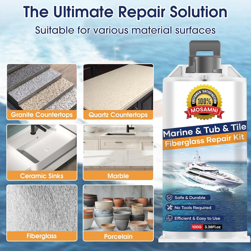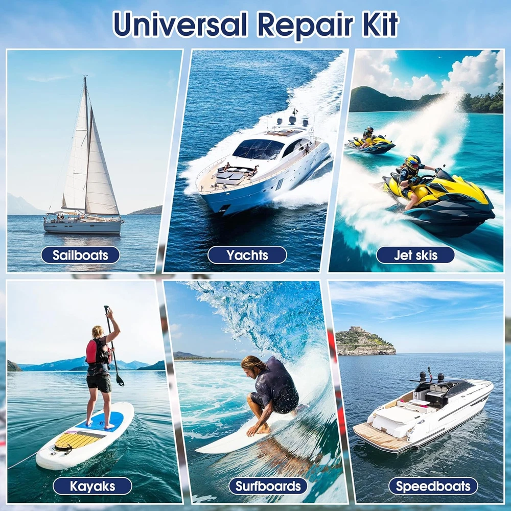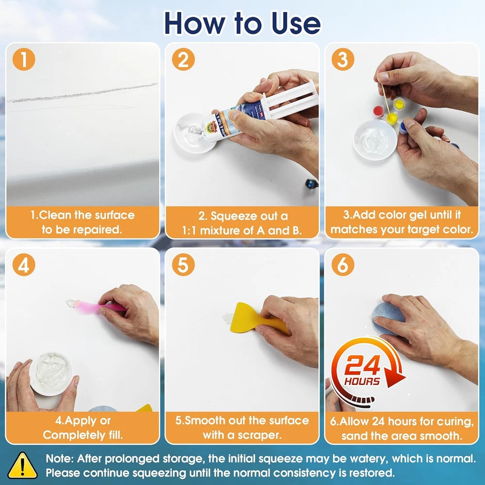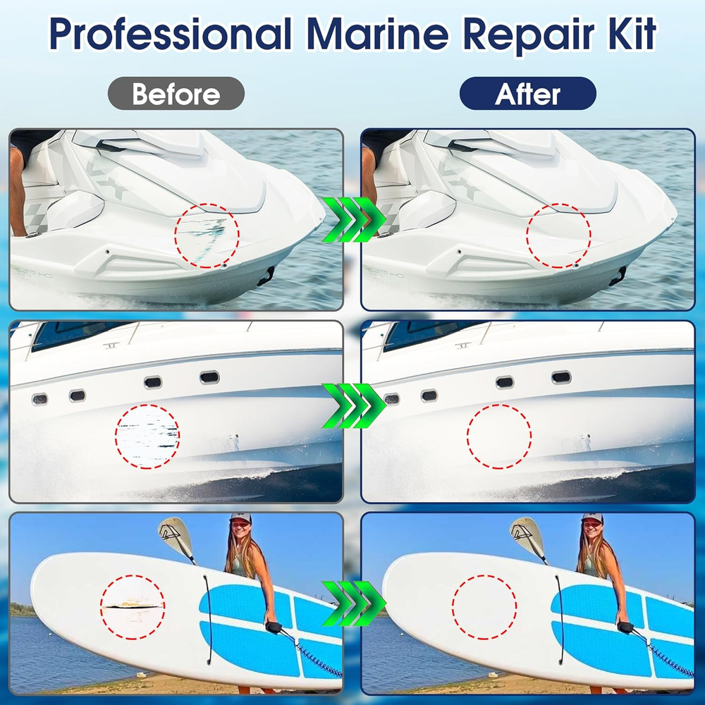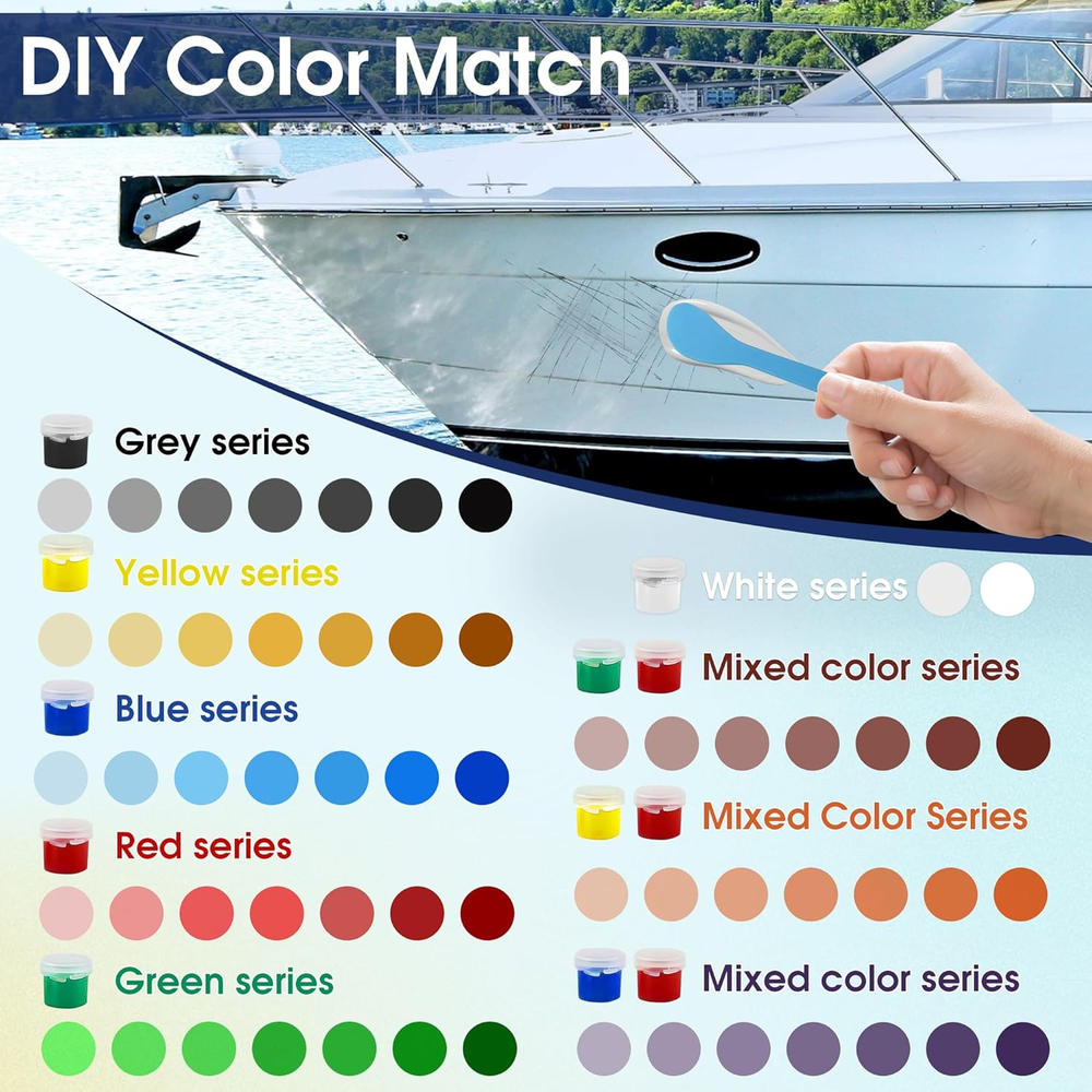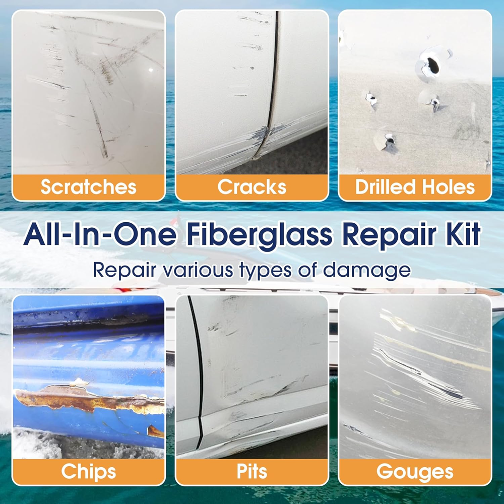Versatile Fiberglass Boat Repair Kit: Effortlessly repair most surface damages like chips, cracks, scratches, gouges, and drilled holes; Suitable for a wide range of vessels including boats, kayaks, jet skis, canoes, and sailboats, as well as on decks and surfboards; Works on various materials like carbon fiber, aluminum, ceramic, porcelain, acrylic, and more Precise Color Matching: This gel coat repair kit includes white base color and 6 color pastes (red, yellow, blue, green, black, white); Easily blend custom colors to achieve a seamless, invisible repair that perfectly matches your vessel's original finish after curing and sanding Durable & Weather-Resistant Finish: Once cured, the repair area forms a hard, protective layer with strong bond; Provides excellent waterproofing and UV resistance, designed to withstand harsh marine conditions without peeling or fading for long-lasting hull protection Simple DIY Application: Achieve professional-grade results in a few easy steps; The fiberglass repair kit includes all necessary tools—just mix, apply, smooth, and sand; Our detailed instructions guide you to a flawless finish, making it perfect for both beginners and experienced boat owners No Additional Tools Required: This repair kit comes with every component you need to get the job done right, no extra tools required MOSAMNI Fiberglass Boat Repair Kit (Color Match), Gel Coat Repair Kit for Boats, Marine Fiberglass Repair Kit for Boats, Fix Holes Chips Pit Cracks