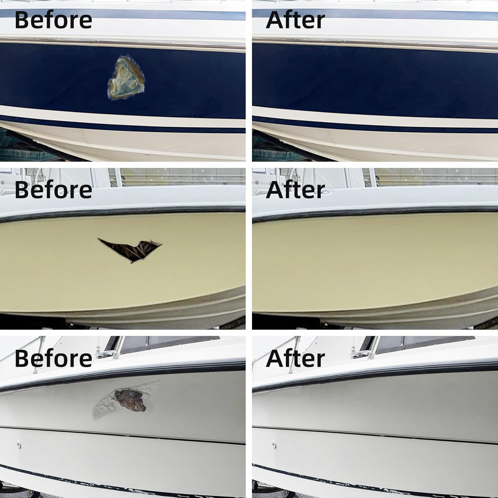 【Multifunctional Marine Fiberglass Repair Kit】It is suitable for repairing chips, cracks, pits, gouges, scratches and holes on various watercraft such as jet skis, canoes, kayaks, sailboats, speedboats, yachts, dinghies, surfboards and decks, keeping the vessels in good condition. 【Color Matching】It is equipped with a white base color and four colors pastes including blue, brown, maroon and black, enabling seamless repairs and perfectly matching the original color of the boat. 【Extremely Hard and Durable】After curing, the marine fiberglass repair kit has super-strong adhesion, is resistant to ultraviolet rays and waterproof, causing no damage to the fiberglass boat surfaces and being able to withstand harsh marine conditions. It is also safe for both users and the environment. 【Easy to Use】Clean the repair area thoroughly and keep it dry. Then cover the surrounding areas with stickers. Mix Part A and Part B in a 1:1 ratio. Add color pastes to adjust the color. Apply the mixture, smooth it with a scraper, and remove the tape. Wait for 24 hours for it to cure. Finally, sand the repaired area with sandpaper until it is smooth. 【Your satisfaction is our pursuit】Any product-related problems are welcome to contact us, we will do our best to serve you! Product Description Special declaration: 1、The product itself is white, and if you are repairing white items, you do not need to add any color paste. 2、The packaging contains four colors pastes, namely black paste, brown paste, maroon paste and blue paste. 3、Adding different amounts of black paste can adjust the gray series of colors. 4、Adding different amounts of brown paste can adjust the series of colors. 5、Adding different amounts of maroon paste can adjust the date red series of colors. 6、Adding different amounts of blue paste can adjust the blue series of colors 7、Adding two or more color pastes at the same time can adjust the mixed series of colors. Package Includes: 4 colors gels - Black gel *1, Brown gel *1, Maroon gel *1, Blue gel *1 PART A *1, PART B *1 Scraper *1 Wood Stick*2 Disposable Gloves*2 Toothpick*4 Sand Paper*2 FENFANDAS Marine Fiberglass Repair Kit is a multifunctional repair kit. It is suitable for repairing chips, cracks, pits, gouges, scratches and holes on various watercraft such as jet skis, canoes, kayaks, sailboats, speedboats, yachts, dinghies, surfboards and decks, keeping the vessels in good condition. It is equipped with a white base color and four colors pastes including blue, brown, maroon and black, enabling seamless repairs and perfectly matching the original color of the boat. After curing, the marine fiberglass repair kit has super-strong adhesion, is resistant to ultraviolet rays and waterproof, causing no damage to the fiberglass boat surfaces and being able to withstand harsh marine conditions.
