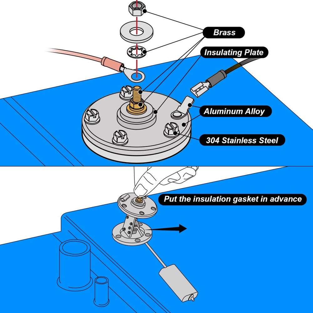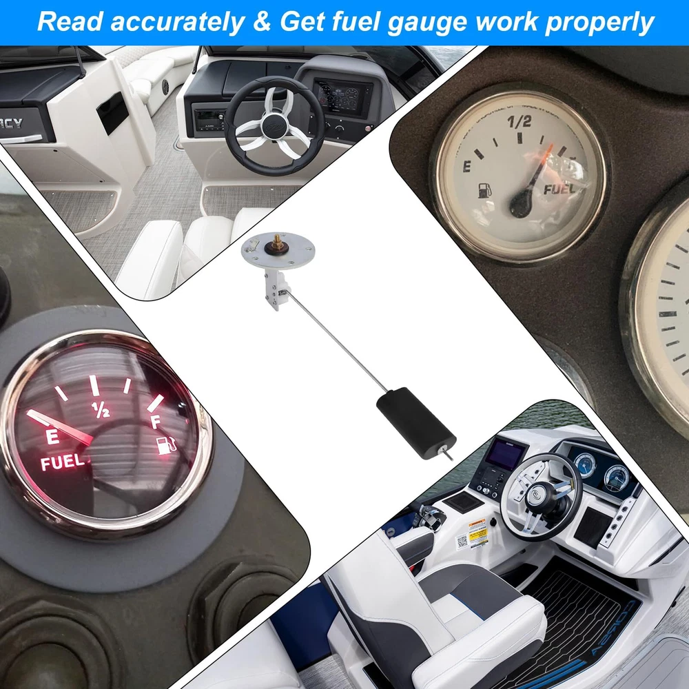 Marine Fuel Sending Unit,Boat Fuel Tank Sending Unit for Marine 6-12 Inch Depth RV Car Truck Tanks 33-240ohms Gas Water Level Gauge Sender Great marine fuel sending unit replacement for broken boat fuel sending unit in marine boat fuel tank. Read accurately fuel gas gauge display the water gas fuel level information in boat marine RV car truck tank, no need worry about how much the water gas fuel left. Flexible & adjustable: The marine fuel sender unit is easy to cut depending on tank depth, swings flexibly in tight spaces in the correct direction by loosening the center screw to rotate and re-tighten OR cut on demand. Heavy quality boat fuel sending unit : Brass top fitting + 304 stainless steel screws + aluminum alloy base for corrosion resistant and durable Wide application: The boat fuel tank sender unit is great for 6 to 12 inch depth boat fuel tank/marine fuel tank/marine truck car gas tank /tractor diesel tank/truck water tank. Compatible with 33 to 240 ohm marine boat RV car truck dash gauges. Easy to Install: First,check the tank depth to make sure correct length for accurate reading.Then cut/adjust the marine fuel tank sender unit length into the tank. Finally wiring to the gauge on the dash Marine Boat Fuel Tank Sending Unit,6 to 12 Inch Tanks,Gas Diesel Boat Fuel Sender Unit Brass + 304 stainless steel + aluminum alloy The marine fuel level sender fit tank depth: 6 to 12 inches Great for boat fuel tank/marine fuel tank/marine truck car gas tank /tractor diesel tank/truck water tank Fuel gas sender unit compatible with 33 to 240 ohm dash mounted gauges Easy to adjust: The length of boat gas tank sending unit can be changed as long as you want and the center screw can be loosened and easily adjusted by turning and re-tightening. The proper length gives the marine fuel level sending unit the flexibility to swing in the right direction. Must have for boat owner: Not knowing how much fuel is left in the tank is very inconvenient and unsafe for boat owners or water sports enthusiasts. When the diesel fuel tank sending unit is broken the fuel gauge will not work properly, replacing the boat fuel gas tank sender unit with a new one will bring the fuel gauge back to normal, keep gas gauge reading accurately, and allow you to safely enjoy your water sports or carry out your boat work! Easy to install: Measure tank depth and check pressure gauge before installing the fuel gauge sending unit, cut to length to fit tank. Warm tips: Keep old mounting screws in case. Place the gasket before placing fuel water level sensor in the tank. Check your tank depth before choose the marine boat water level gauge sensor to insure an accurate reading. Shipping We offer FREE shipping on all orders! We ship within Three business days of payment, usually sooner. We use a selection of shipping services such as UPS, FedEx, USPS etc. We only ship to the lower 48 states, no APO/FPO addresses or PO Boxes allowed. Local pickups and combined shipping options are not provided at this time. Return You can return a product for up to 30 days from the date you purchased it. Any product you return must be in the same condition you received it and in the original packaging. Please keep the receipt. Payment We accept payment by any of the following methods: PayPal Please pay as soon as possible after winning an auction, as that will allow us to post your item to you sooner! Feedback Customer satisfaction is very important to us. If you have any problem with your order, please contact us and we will do our best to make you satisfied. Contact Us If you have any queries, please contact us via ebay. We usually respond within 24 hours on weekdays. Please visit our eBay store to check out other items for sale! Thank you for shopping at our store.
