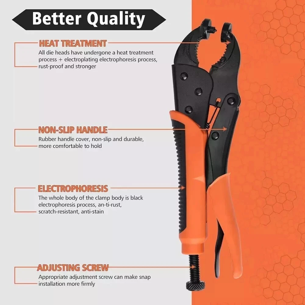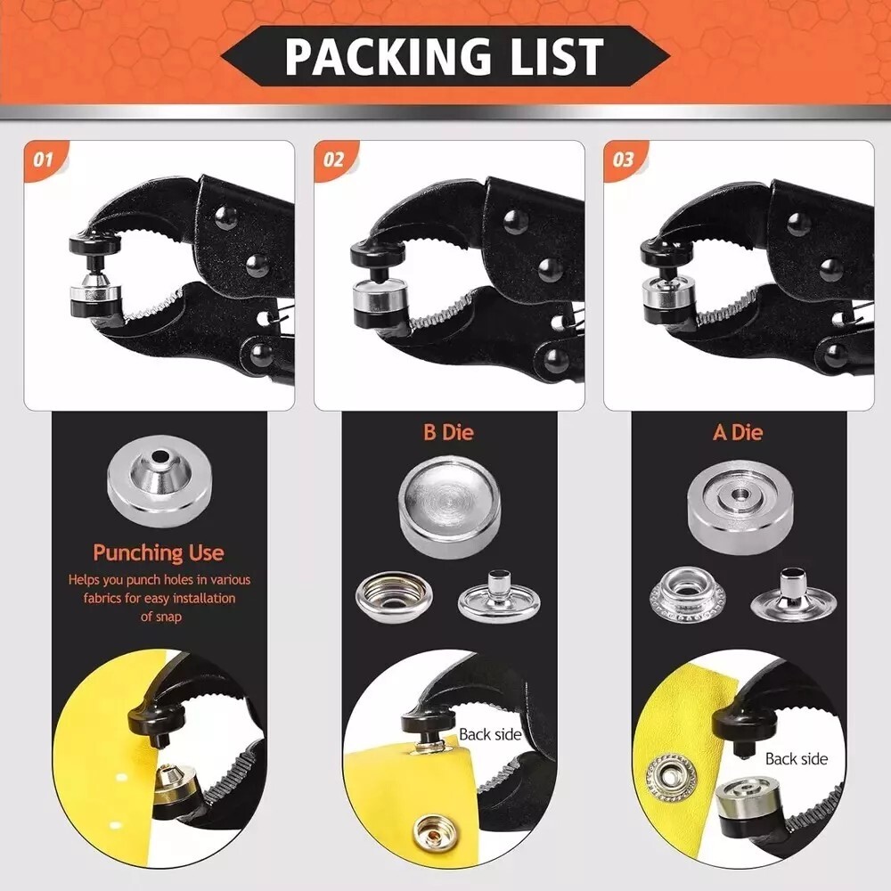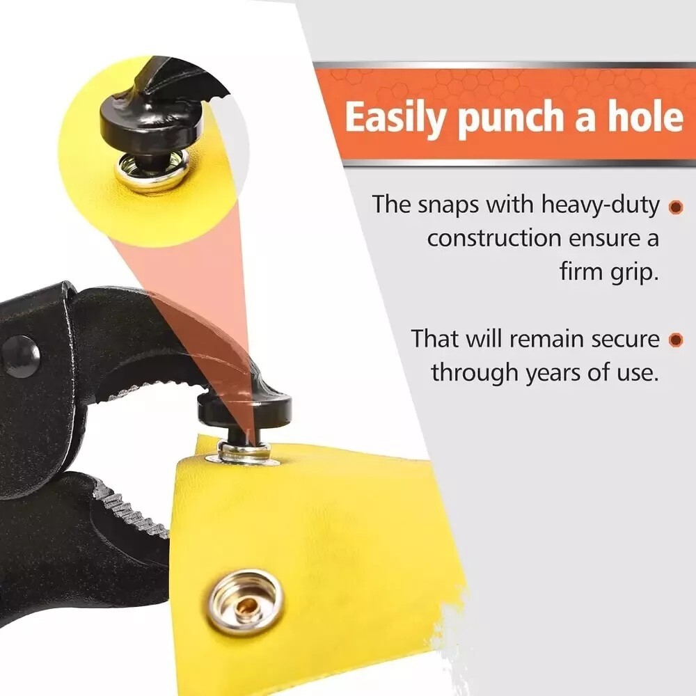 More Comprehensive: You can save a Hole Punch if you buy our snap setter tool! CENOZ adds a punching die, allowing you to complete all projects with one-hand tools. Helps with major or minor repair of canvas covers, tarps, boat covers, sail covers, bimini tops, tonneau covers, or any heavy fabric. Canvas Snap Pliers: Snap design is super sturdy! Adjustable Plier can avoid falling off when snapping. They were widely used for installing/repairing metal snaps on leather/boat canvas/carpet/tarp/covers/furniture, etc. Easier and Faster: Adjustable pliers design enables greater leverage over die-and-peg snap tools, the vice grip system allows you to get good leverage to crimp the two pieces together, a tighter snap, not easy to fall off. Multiple Functions: In addition to being able to install snap, our snap press kit also includes a new punching function, which allows you to create clean and precise holes for your metal snaps. Plus, The magnetic suction design allows you to work with ease and remove and replace quickly. Durable and Rust-Resistant: Made from high-quality alloy steel, the snap setter tool is built to last and is not prone to rust or corrosion. The sturdy and durable main body ensures that it can withstand heavy use and will remain a reliable tool in your toolbox for years to come. Adjustable Tail Bolt: No matter what thickness of the material you're working with, our snap installation tool tail bolt can be easily adjusted to ensure a perfect fit every time. This feature makes it even more versatile, like canvas, boat covers, leather, fabric, etc. CENOZ Gold Service: If you receive a product that is missing parts, contact us through the background and we will reply to you within 24 hours. Perfect Combination Set: Heavy duty snap fastener kit easier to carry, a snap tool for boat covers comes with extra fasteners, 1 snap button fastener+3 dies+(50 set screw snap buttons+50 set 15mm snap buttons) with a storage box. Product Description Quality spring accessories The high-strength traction spring saves effort. When the jaws are opened, the jaws are kept at a fixed angle, and are closed, the clamping is firmer. 3 Replaceable Die From durable materials to precise craftsmanship, our accessories are designed to enhance your overall experience. Adjustable Bolt Contral The Pressing Force of Plier, Make Installation Firmly.Suitable for Various Types of Snaps. Phosphating treatment We have adopted advanced phosphating treatment technology, which makes our canvas snap pliers have corrosion-prevention properties! Top About this item Similar Product information Questions Reviews
