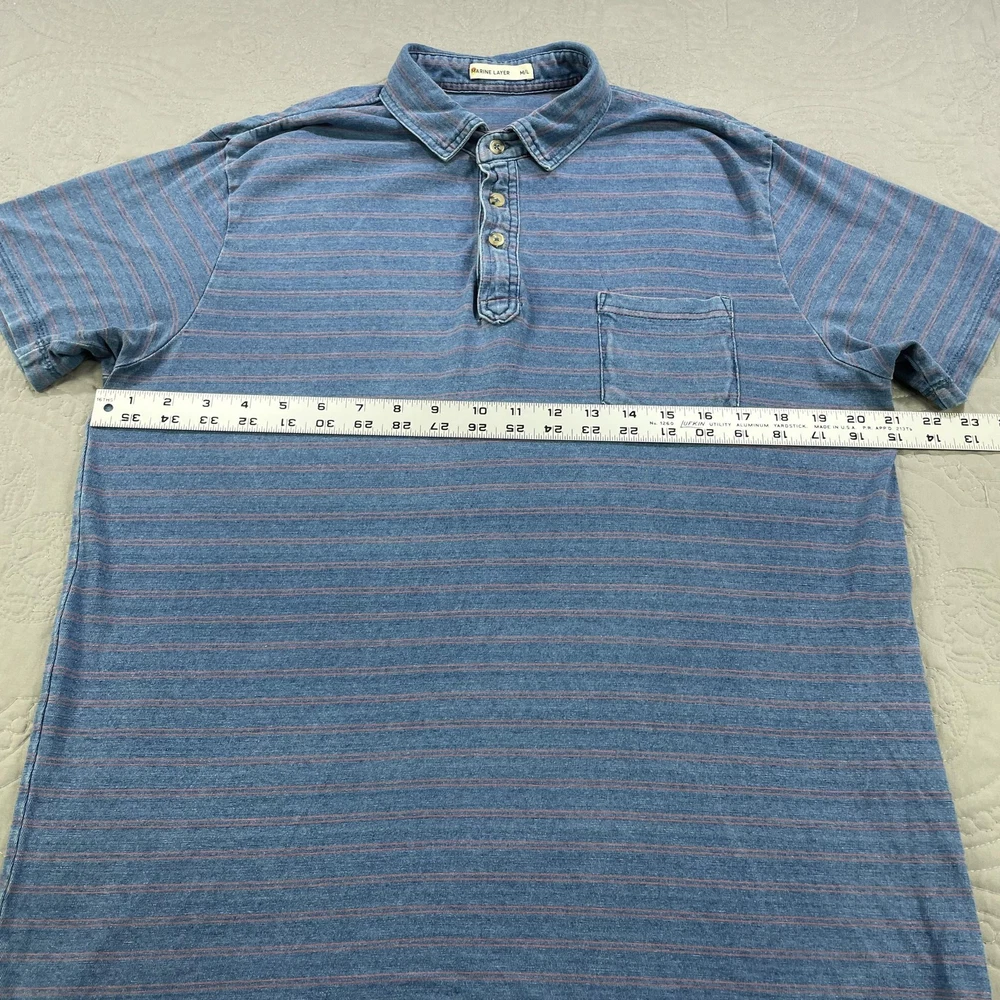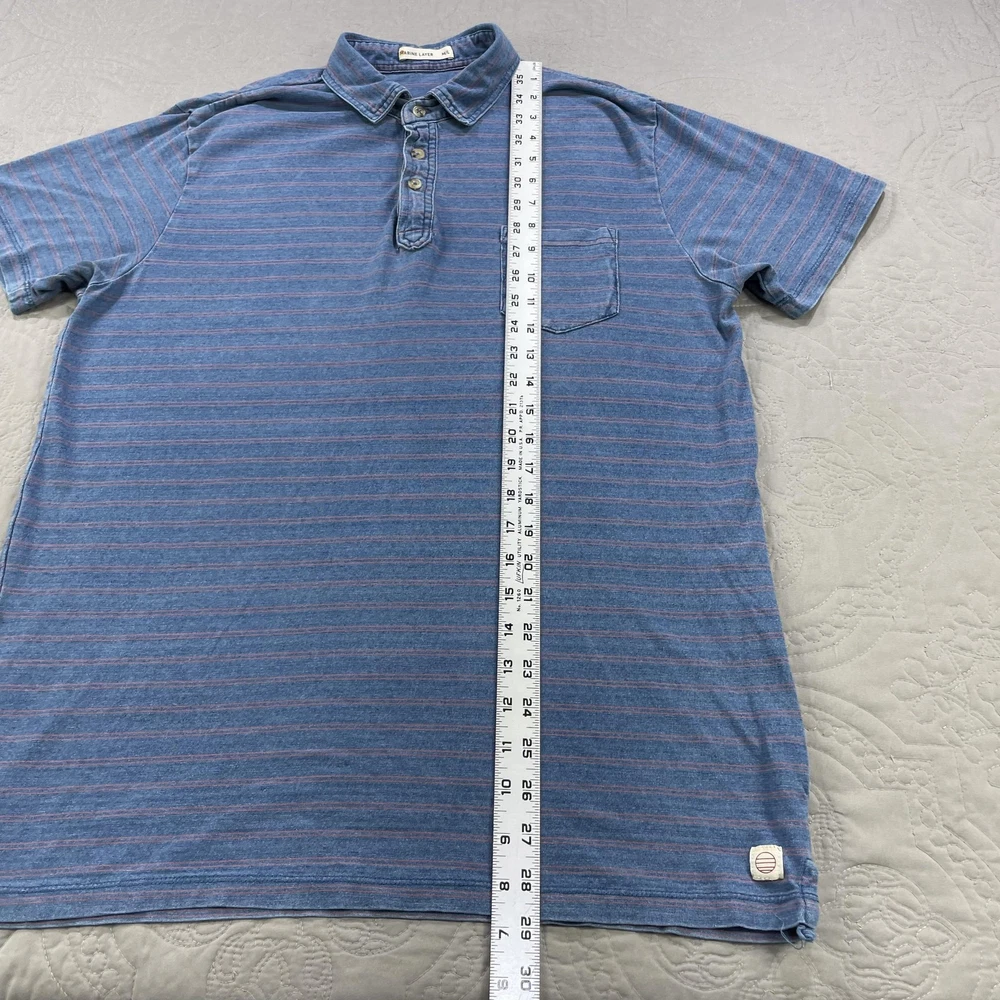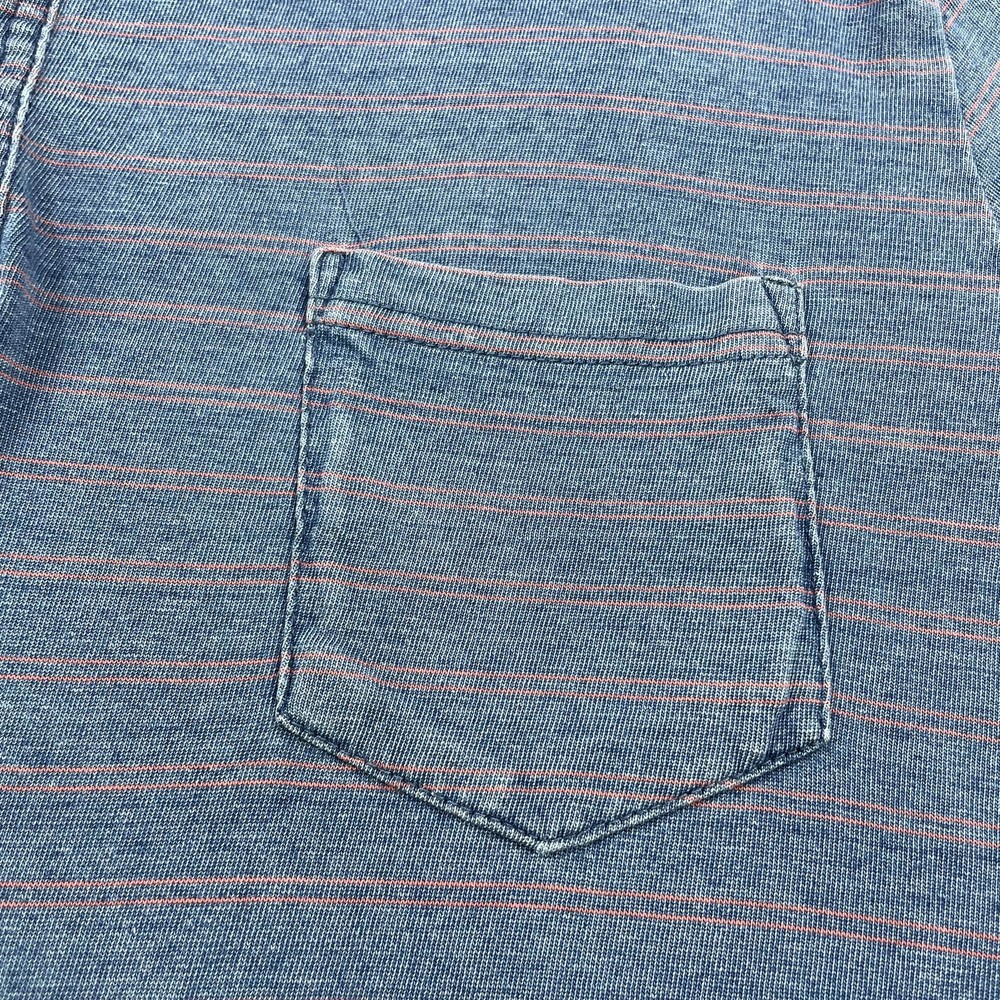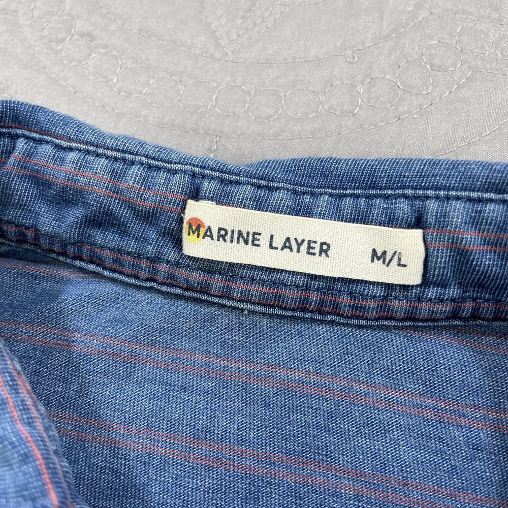 Marine Layer Shirt Mens Medium Large Blue Striped Polo Pocket Short Sleeve Casual Condition: Good used condition. Lightly worn with some minor fabric wear and a small hole near the placket (see photo for detail). No major stains noted. Material: 50% Polyester, 50% Cotton Features: Soft washed blue with thin coral-red horizontal stripes, 3-button polo placket, chest pocket, collared, short sleeves, split side hem, stitched logo patch at lower left hem Tag size: M/L (Mens Medium/Large) Flat Measurements (approximate): - Pit to pit: 22.5 in - Length (collar seam to hem): 29 in Brand: Marine Layer (as shown on inside neck tag and lower hem patch) Care: Machine wash cold, dry low Perfect for casual wear, summer, layering, or everyday comfort