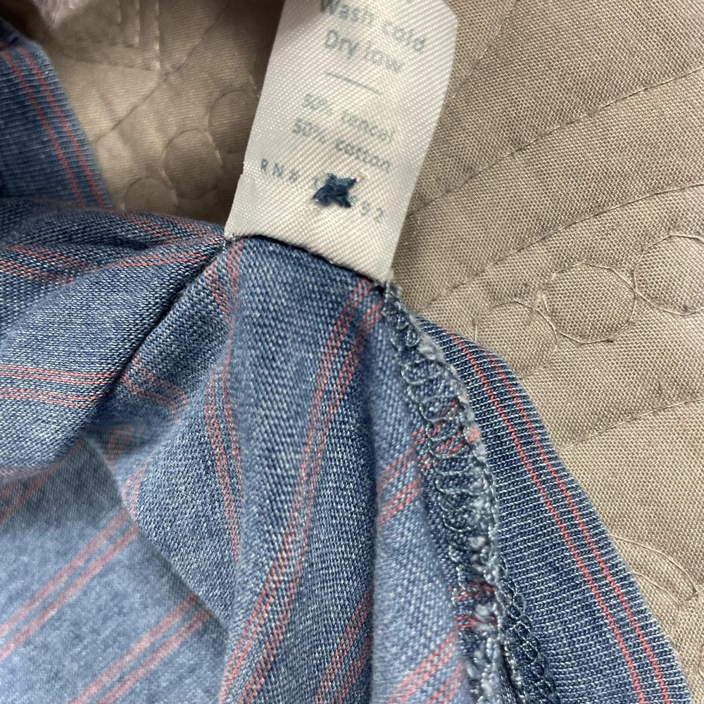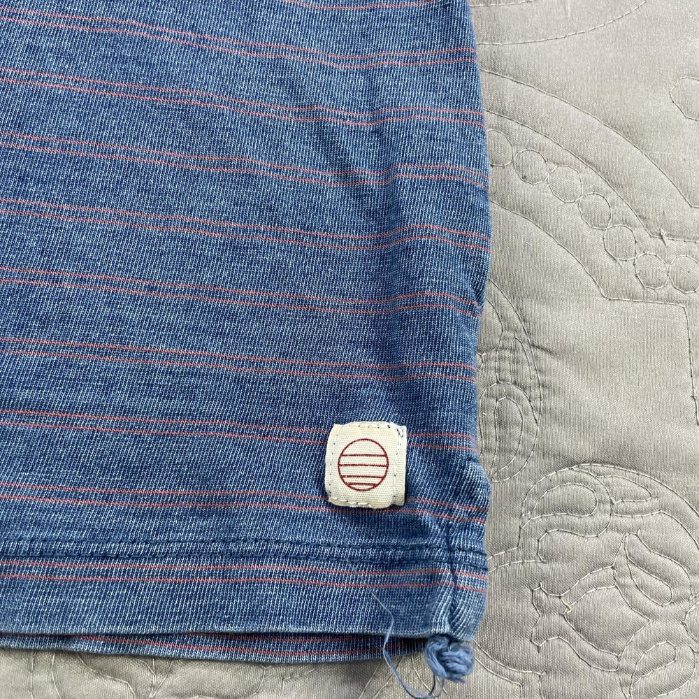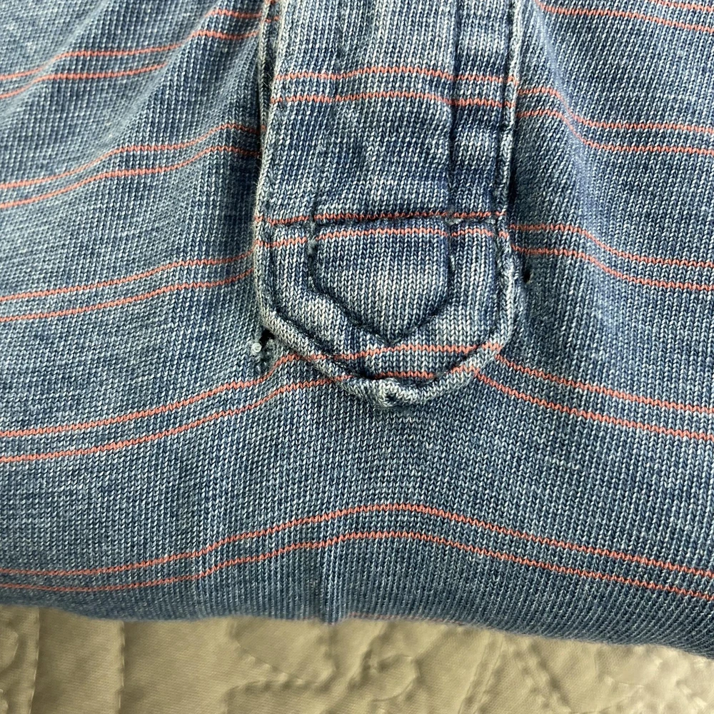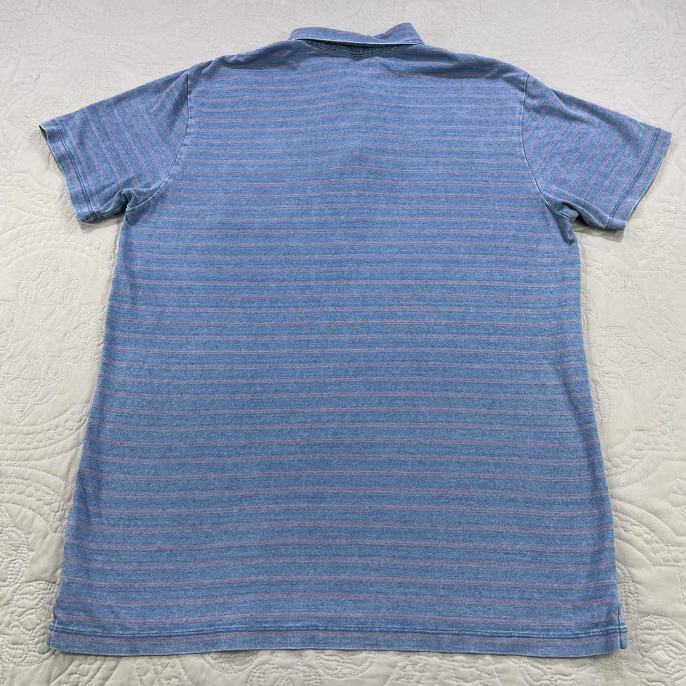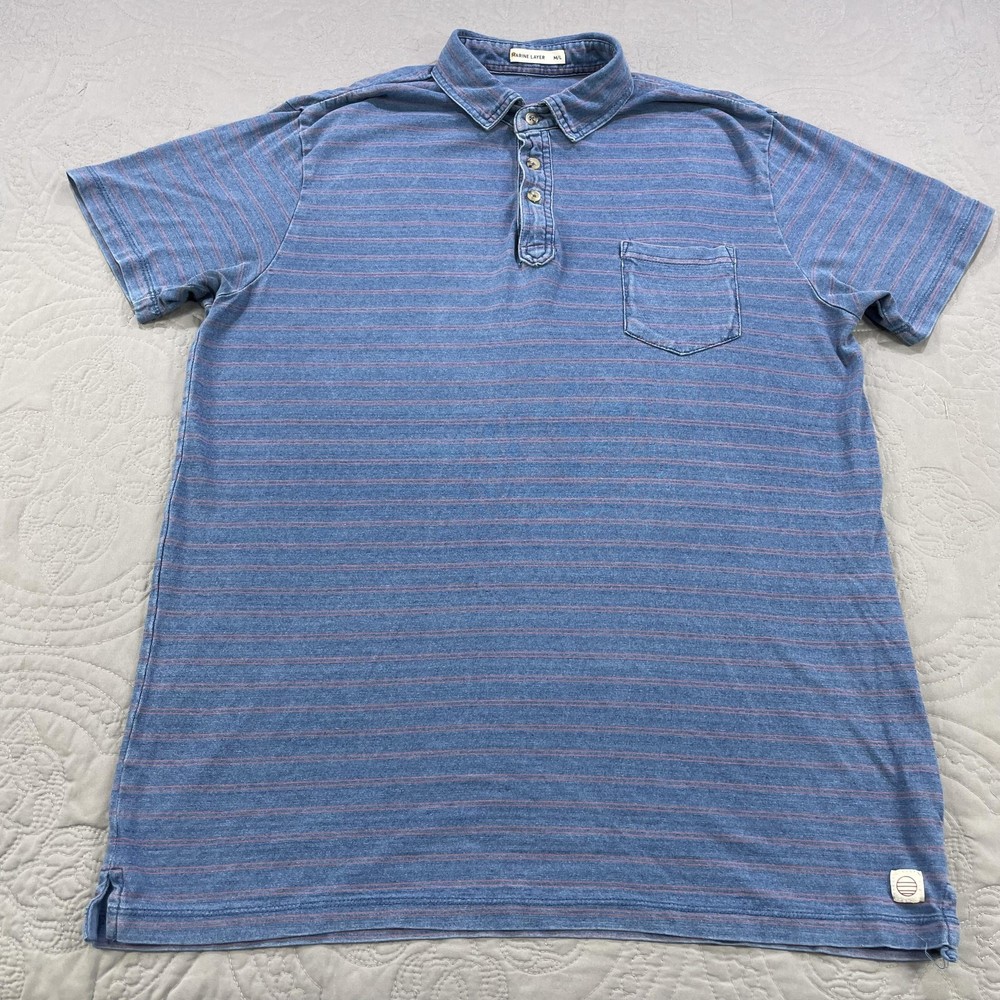 Marine Layer Shirt Mens Medium Large Blue Striped Polo Pocket Short Sleeve Casual Condition: Good used condition. Lightly worn with some minor fabric wear and a small hole near the placket (see photo for detail). No major stains noted. Material: 50% Polyester, 50% Cotton Features: Soft washed blue with thin coral-red horizontal stripes, 3-button polo placket, chest pocket, collared, short sleeves, split side hem, stitched logo patch at lower left hem Tag size: M/L (Mens Medium/Large) Flat Measurements (approximate): - Pit to pit: 22.5 in - Length (collar seam to hem): 29 in Brand: Marine Layer (as shown on inside neck tag and lower hem patch) Care: Machine wash cold, dry low Perfect for casual wear, summer, layering, or everyday comfort