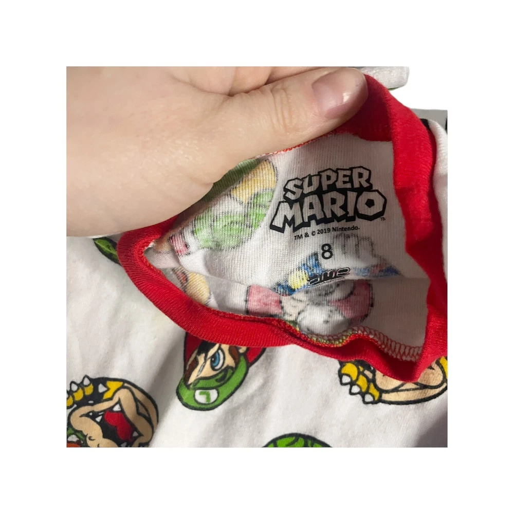 This is a Mario-themed pajama set for boys, size 8. It includes two shirts and shorts in blue and white colors. Made of stretch cotton material, the set is comfortable for sleepwear. The design features a colorful theme and is suitable for young boys who are fans of the Mario character. in good. condition. spot on the white shirt All Measurements Are Approximate Please email us with any questions! ** LIKE THE ITEM BUT NOT THE PRICE, REASONABLE OFFERS ACCEPTED