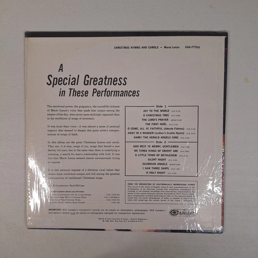 Mario Lanza - Christmas Hymns And Carols LP Vinyl Stereo 1963 Open Shrink
