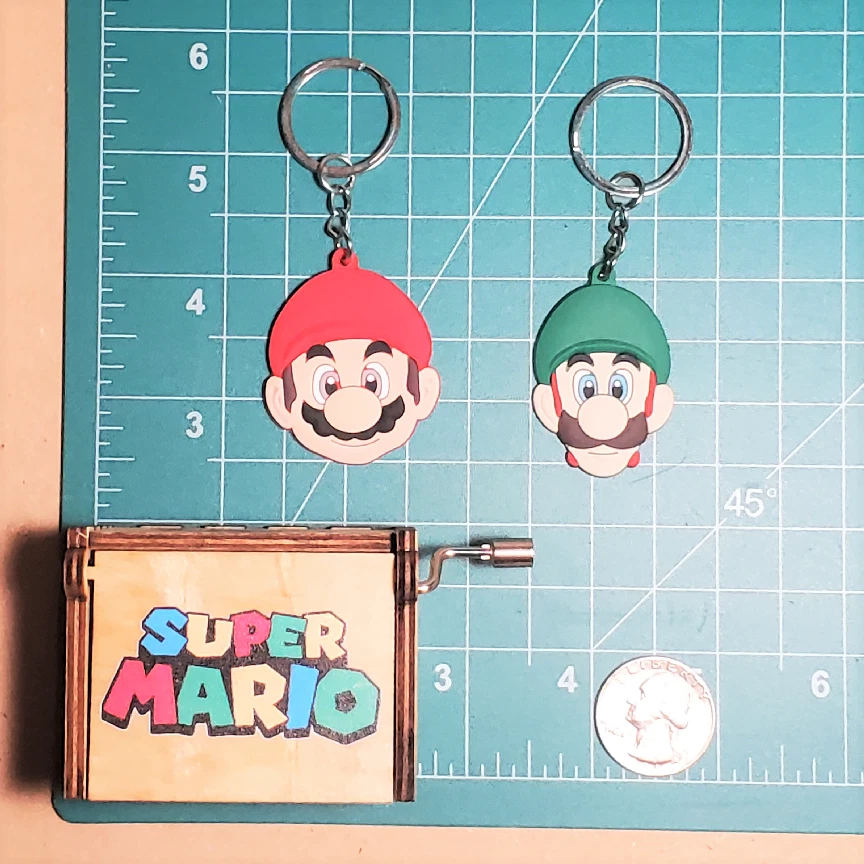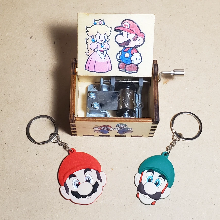 New. Music box and Keychains. Music box: Wooden music box with colorful images Mario, his girl Peach, his boy Luigi, Toad, Yoshi, and the baddy Bowser. Also the Super Mario logo itself. When you turn the crank it plays a music box adaptation of the Super Mario Bros. 8-bit theme song from the first Super Mario Bros. game ever for the Nintendo. Very retro! Music box measures 2.5 inches x 2 inches x 1.5 inches Keychains: Rubber Mario and Luigi keychains. Measure 1 - 1.5 inches each. π More Mario and other game room merch available. Check out my other listings! π