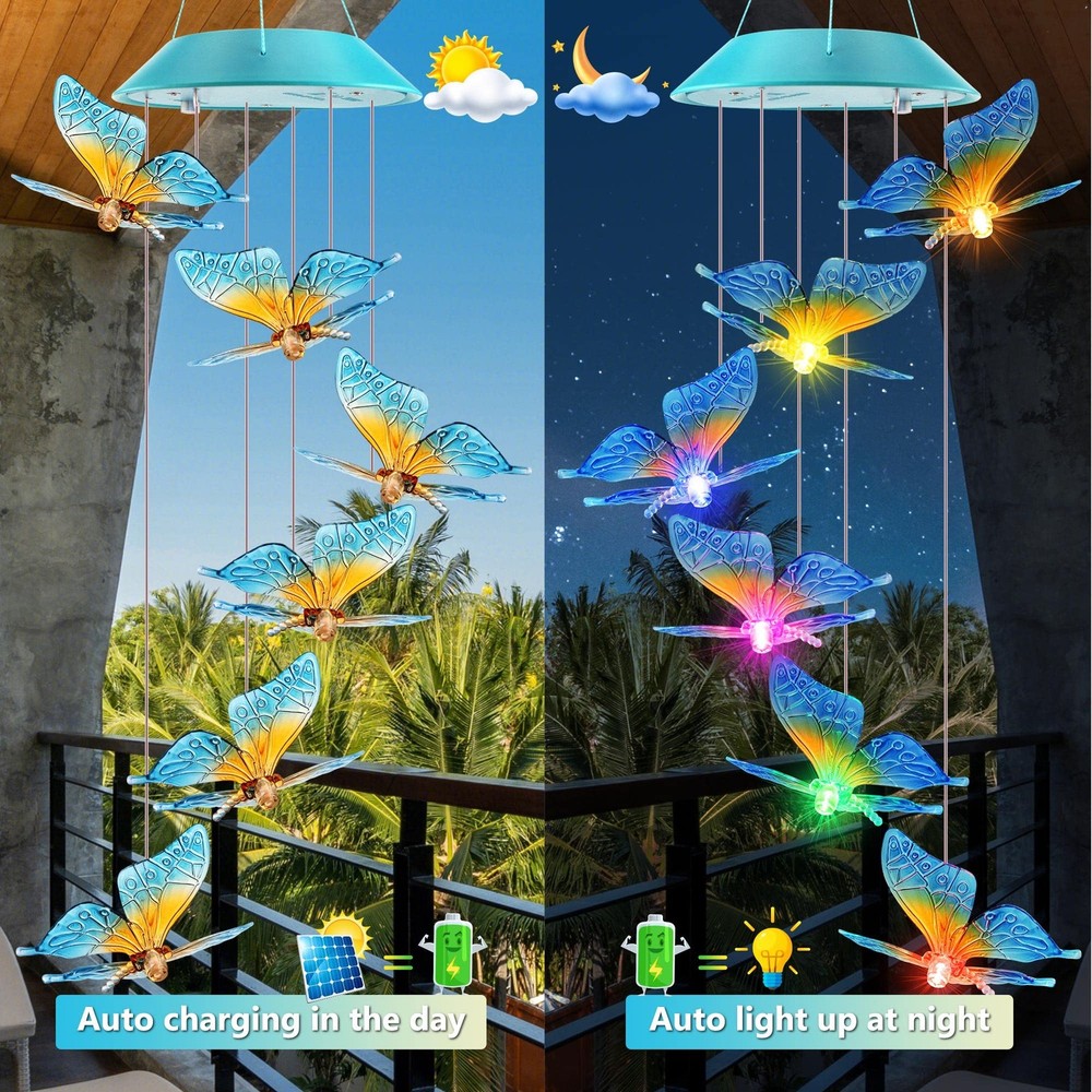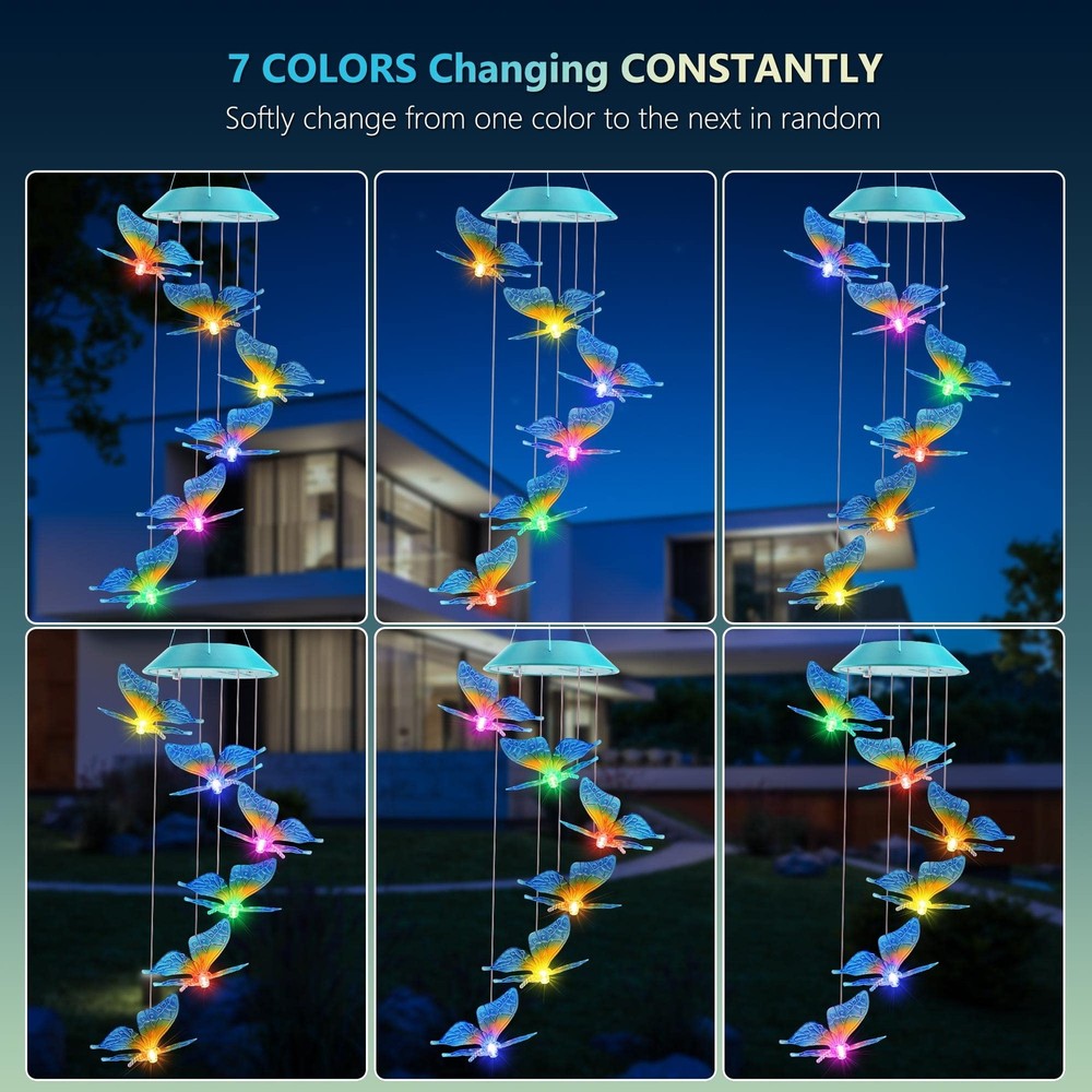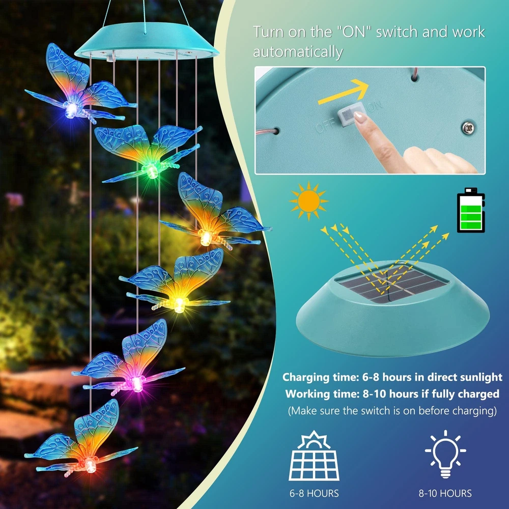 🦋Magical Solar Butterfly Wind Chimes: Turn on the switch on the solar panel and keep it in "ON" position. Then the butterfly wind chimes will auto charge in the direct sunlights and auto light up in the dark. With the upgraded solar panel, the butterfly solar lights can absorb energy quickly and last up to 8-10 hours after fully charged(mothers day gifts,mom gifts,grandma gifts,gifts for mom,gifts for grandma) 🦋Color Changing Decoration Lights: The solar butterfly decorative lights change 7 colors alternatively between red, green, orange, blue, yellow, purple and white. Gradually transition from one color to another, creating surreal visual effects, adding charming lighting displays, and making your surroundings look dreamy and magical. 🦋Hanging and Mobile Solar Wind Chimes: Come with a hanging hook, the solar butterfly wind chimes are easy to hang in your garden, yard, lawn, patio, window, roof, front porch, hall, bedroom, party and anywhere you like to decorate. They are portable and mobile for indoor and outdoor decoration. 🦋Waterproof Solar Lights for Outdoor Decor: With IP65 waterproof and unique rain-proof and moisture-proof design, the solar outdoor lights can be hung indoors and outdoors as a lovely day and night decoration. You can enjoy the sight of the colorful butterfly in the daytime and glowing butterfly at night. 🦋Butterfly Solar Gifts for Mom and Women: These solar wind chimes can not only be beautiful home decor, but also unique gifts for women and girls, such as your mom, grandma, wife, sister, daughter and aunt. The butterfly solar gifts are the best choice for birthdays, Mother's day, Memorial day, Thanksgiving, Christmas.If any problems, please contact us anytime via Amazon e-mail box.